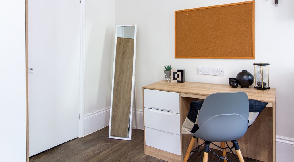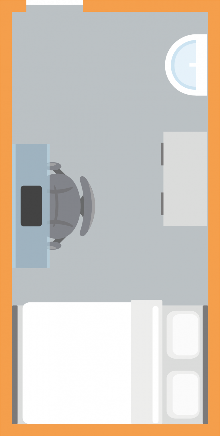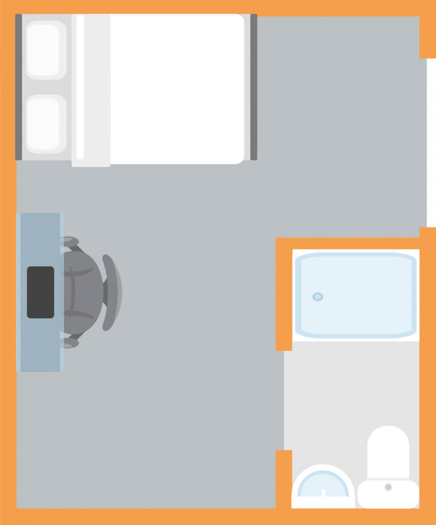The Silver Studio is a an open plan bedroom measuring around 17-18m² with either a double or 3/4 size bed, study desk and plenty of storage. The studio has a modern en-suite bathroom and your own kitchenette within the room.