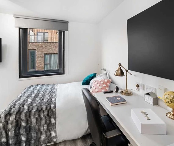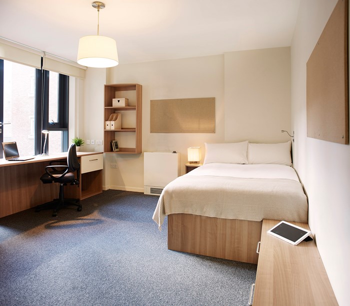 These student rooms come with compact double beds, en suite bathrooms, study area, storage space, and share a living area and kitchen with groups of fellow residents.The shared kitchens have a 4 ring hob, an oven, a microwave, 2 large fridge/freezers, a dining table and a sofa.