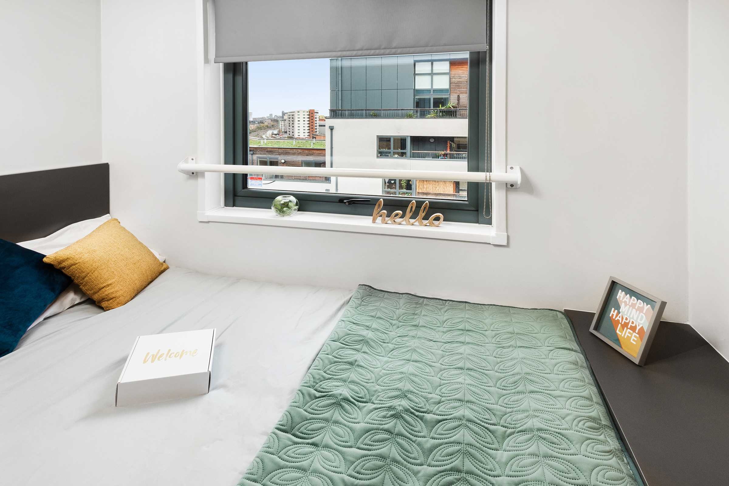 Bronze Studio rooms are 12 - 14 SQM in size. These student rooms come with double beds, en suite bathrooms, a private kitchenette, study area and storage space.