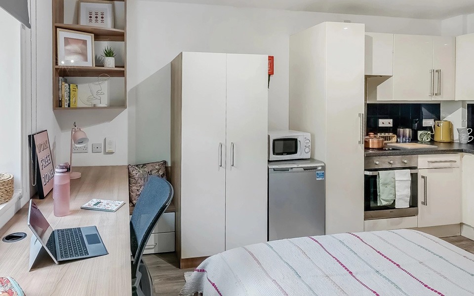 Bronze Studio rooms are 12 - 14 SQM in size. These student rooms come with double beds, en suite bathrooms, a private kitchenette, study area and storage space. The rooms include a bed, chair, desk, wardrobe, drawers and a shelving unit. The en suite bathrooms contain a shower, toilet and sink. The kitchen has a 2 ring induction hob, a microwave, a fridge with freezer compartment and a sink.