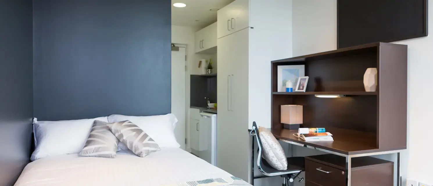 Our bronze studios have an en-suite bathroom, private kitchen, compact Hypnos double bed, study space, living area, and free super-fast broadband. *Price may vary depending on the floor level.