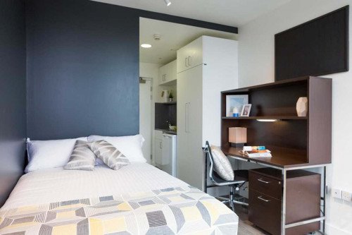 Our bronze studios have en-suite bathroom, private kitchen, compact Hypnos double bed, study space, living area and free super-fast broadband. *Price may vary depending on the floor level.