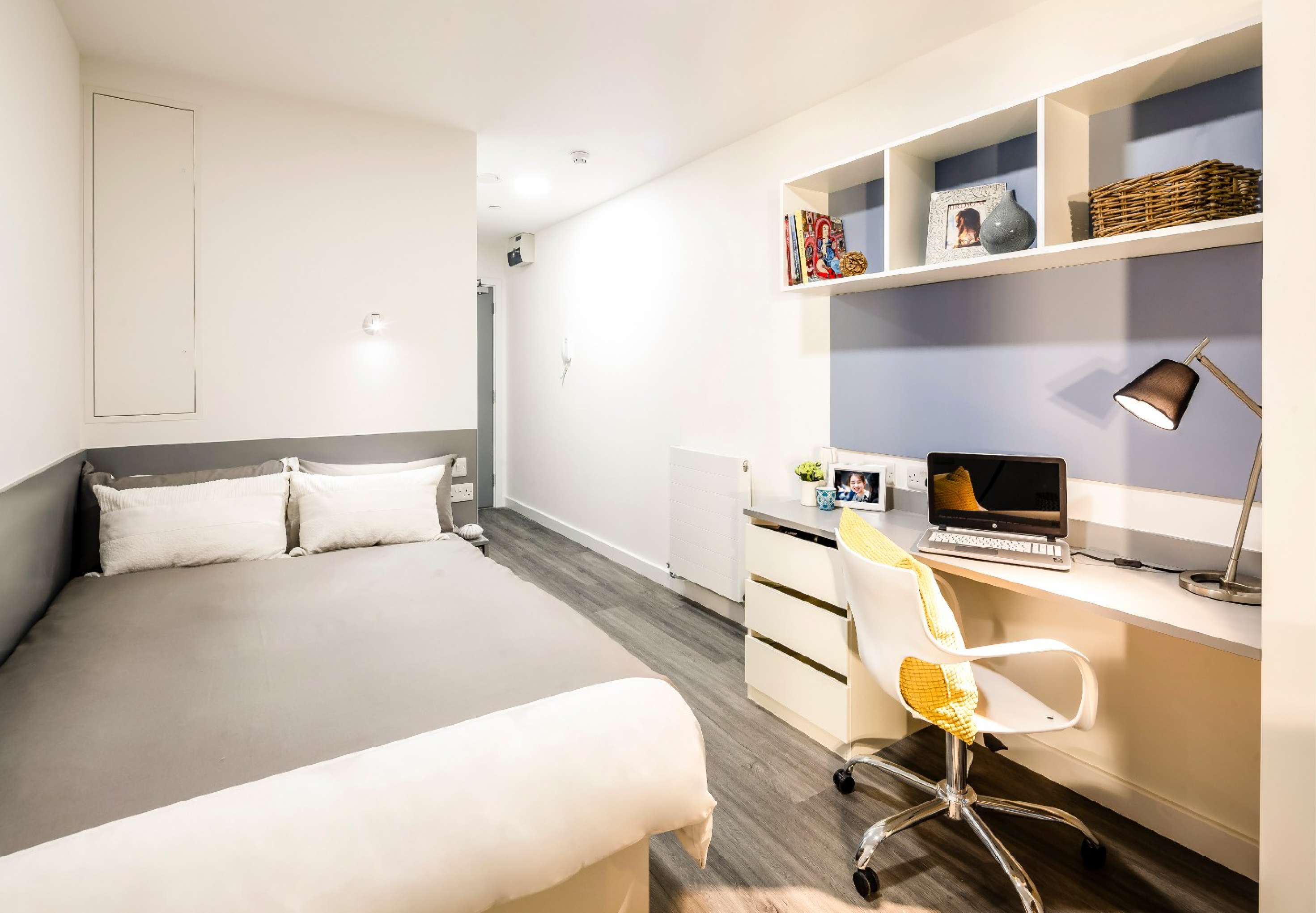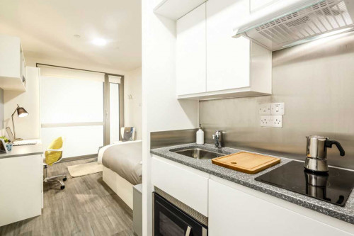 Our bronze studios are 17 SQM in size and come with an en suite bathroom, private kitchen, compact double bed, study space, storage space and superfast broadband. The rooms include a bed, chair, desk and wardrobe. The en suite bathrooms contain a shower, toilet and sink. The shared kitchens have a 2 ring induction hob, a combination microwave/grill/oven, an under-counter fridge with freezer drawer, and a sink.