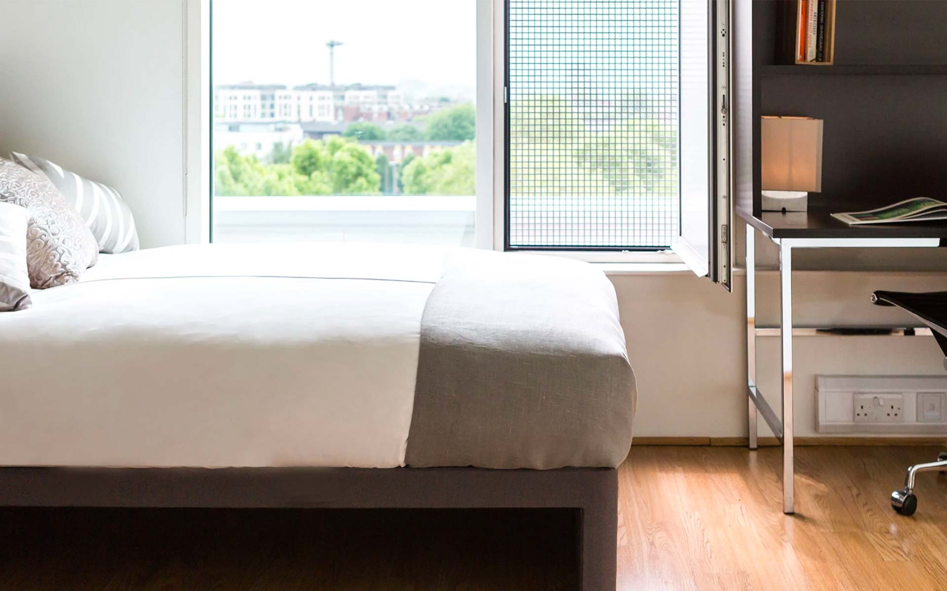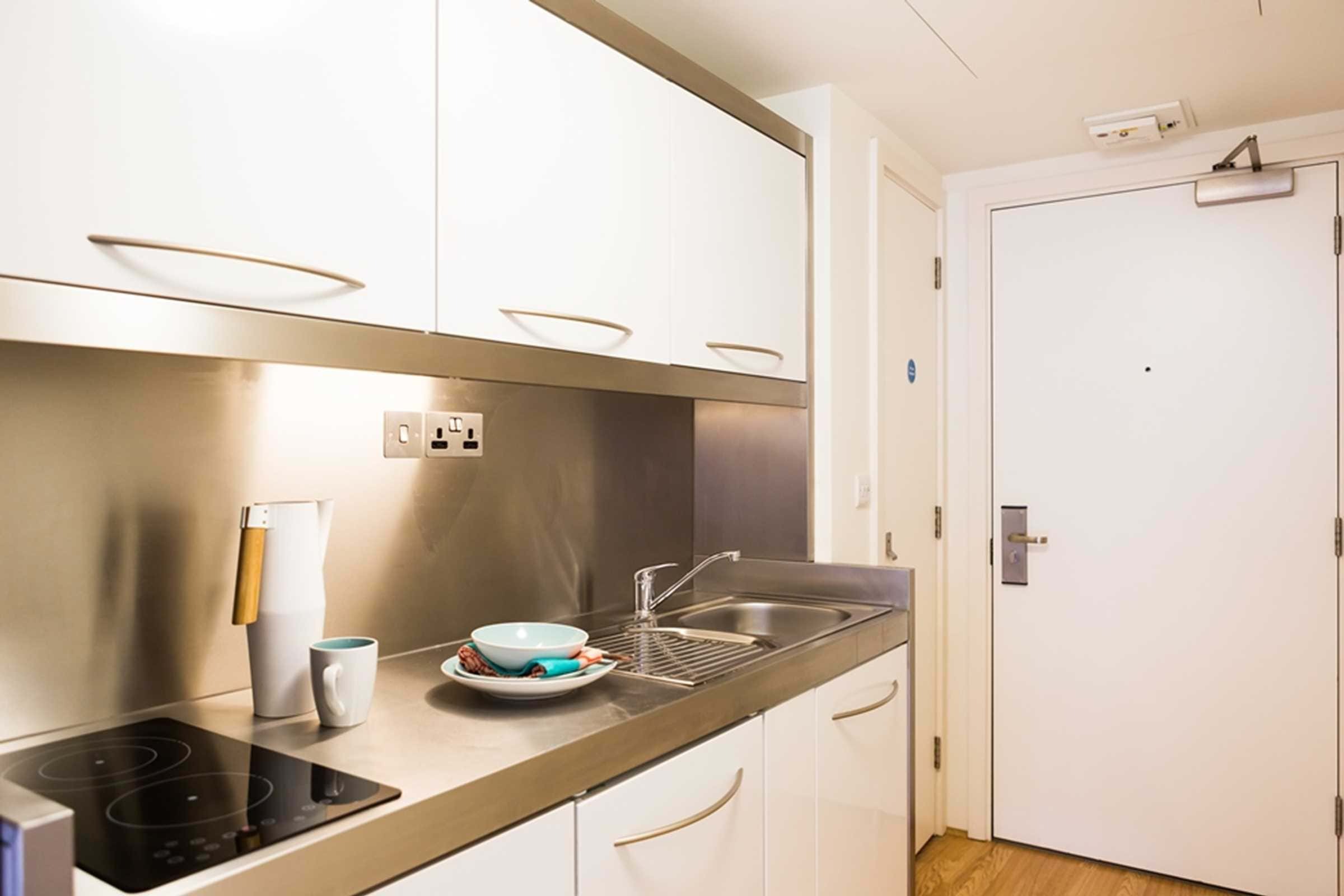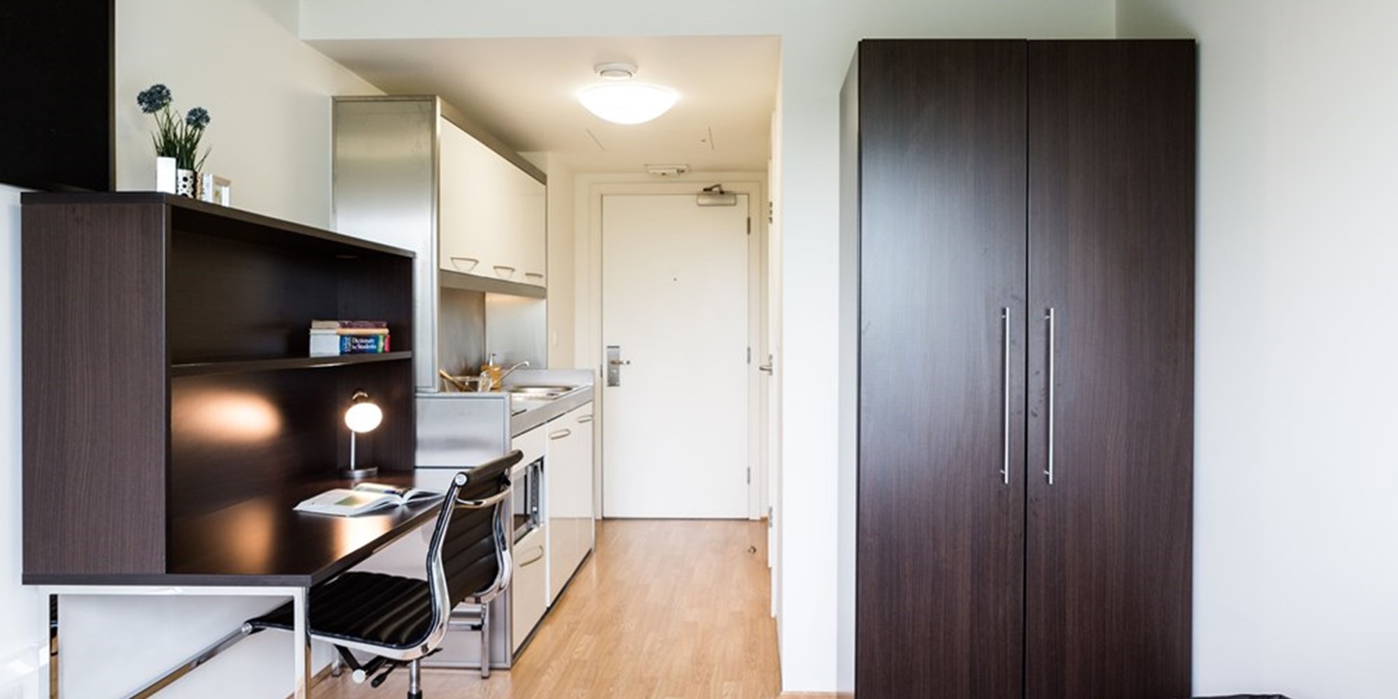 Bronze studios have en-suite bathroom, private kitchen, compact Hypnos double bed, study space, living area and free superfast broadband. Room sizes range from 16.5-17 sq m.