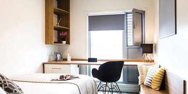 Bronze En Suite rooms are approximately 13 SQM in size. These student rooms come with a compact double bed, an en suite bathroom, study area, storage space, and share a kitchen and living area with small groups of fellow residents. The rooms include a bed, chair, desk, and wardrobe. The en suite bathrooms contain a shower, toilet, and sink. The shared kitchens have a 4-ring induction hob, an oven, a microwave, 2 fridges/freezers, a sink, a dining area, a sofa, and a TV area. Mid-level rooms are on floors 4 - 6.