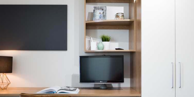 Bronze Studio rooms are approximately 17 SQM in size. These student rooms come with a double bed, an en suite bathroom, a private kitchenette, a study area, and storage space. The rooms include a bed with under-bed storage, a chair, a desk, a TV, a shelving unit, and a wardrobe space. The en suite bathroom includes a toilet, shower, and sink. The private kitchenettes have a 2-ring hob, an oven, a microwave, an under-counter fridge with a freezer drawer, and a sink. Mid-level rooms are on floors 5 & 6.