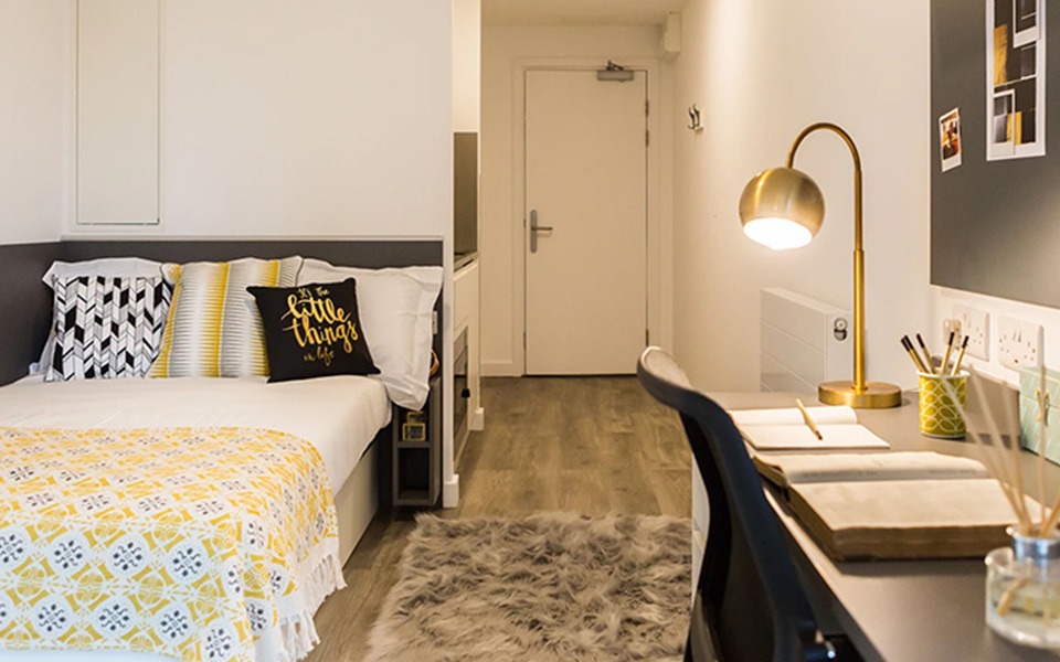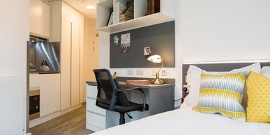 Gold Studio rooms are approximately 17 SQM in size. These student rooms come with a compact double bed with under-bed storage, an en suite bathroom, private kitchenette, a study area and storage space.