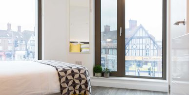 Silver Studio rooms are approximately 15-16 SQM in size. These student rooms come with a compact double bed with under-bed storage, an en suite bathroom, private kitchenette, study area and storage space. The rooms include a 3/4 size double bed, chair, desk, magnetic board, wardrobe, shelving units, a radiator and multiple USB & power sockets. The en suite bathrooms contain a shower, toilet, sink and auto-demist light mirror. The kitchenettes have a 2 ring induction hob, a combination microwave/oven, an under-counter fridge with freezer drawer, and a sink. Silver Studio Premium View are a mixture of corner rooms with windows over Westway and Old Oak Road (levels 2 - 6) and Standard shape Studios facing Westway only and have Dual-Window.