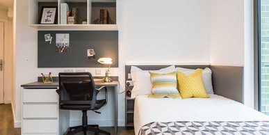 Silver Studio rooms are approximately 15-16 SQM in size. These student rooms come with a compact double bed with under-bed storage, an en suite bathroom, private kitchenette, study area and storage space. The rooms include a 3/4 size double bed, chair, desk, magnetic board, wardrobe, shelving units, a radiator and multiple USB & power sockets. The en suite bathrooms contain a shower, toilet, sink and auto-demist light mirror. The kitchenettes have a 2 ring induction hob, a combination microwave/oven, an under-counter fridge with freezer drawer, and a sink Upper level rooms are on floors 5 & 6.