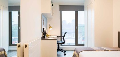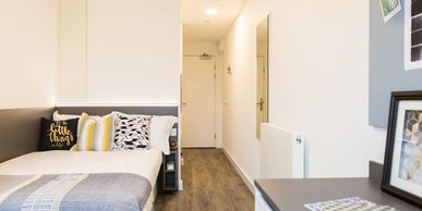 The rooms include a 3/4 size double bed, chair, desk, magnetic board, wardrobe, shelving units, a radiator and multiple USB & power sockets. The en suite bathrooms contain a shower, toilet, sink and auto-demist light mirror. The kitchenettes have a 2 ring induction hob, a combination microwave/oven, an under-counter fridge with freezer drawer, and a sink.