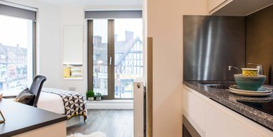 Gold Studio rooms are approximately 17 SQM in size. These student rooms come with a compact double bed with under-bed storage, an en suite bathroom, private kitchenette, study area and storage space.