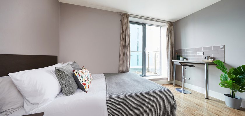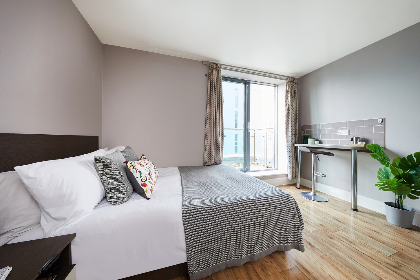 Small Double Bed, Under-Bed Storage, Large Wardrobe, Study Desk and Chair, En-suite, Private Kitchen Area