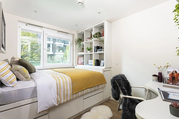 Drapery Place is a London student accommodation that offers en-suites. The en-suites come in two styles: premium range 1 en-suite and premium range 2 en-suite. In addition to the previously mentioned, the building also provides studios that come in four styles: classic studio, premium range 1 studio, premium range 2 studio, and premium range 2 twin studio. All rooms at Drapery Place feature a double bed, an en-suite bathroom, a fully-equipped kitchen, a desk and a chair, a bedside table, a wardrobe, and under-bed storage.