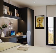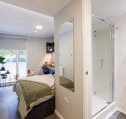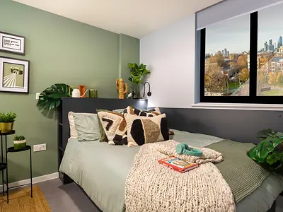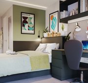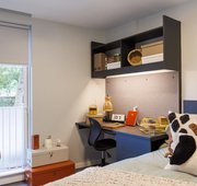 What's in the room? Room sizes may vary from 14.2m² – 15.2m² ¾ size double bed with under bed storage En-suite bathroom with shower and WC Full-length mirror Pinboard Study desk with drawer space and chair Wardrobe What’s in the shared kitchen? 4-ring hob with extractor Electric oven Full-size fridge freezer Lounge / sofa area Shared dining table and chairs