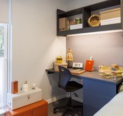 What's in the room? Room size is 27.7m² Double bed with under bed storage 2-ring hob with extractor Breakfast bar En-suite bathroom with shower and WC Full-length mirror Integrated fridge with freezer compartment Combi microwave and mini grill oven Pinboard Stool Study Desk with drawer space and chair Wardrobe