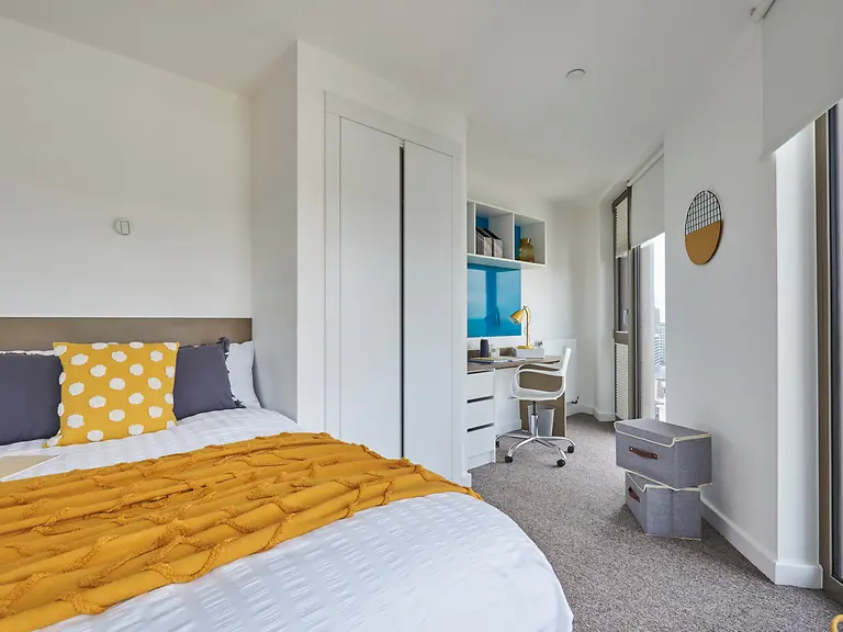 Located between 6th and 10th floor. Room sizes can vary from 17.1m2 to 18.8m2. Private kitchen facilities Small double bed with under bed storage Wardrobe En-suite shower room Study desk and chair Views of London