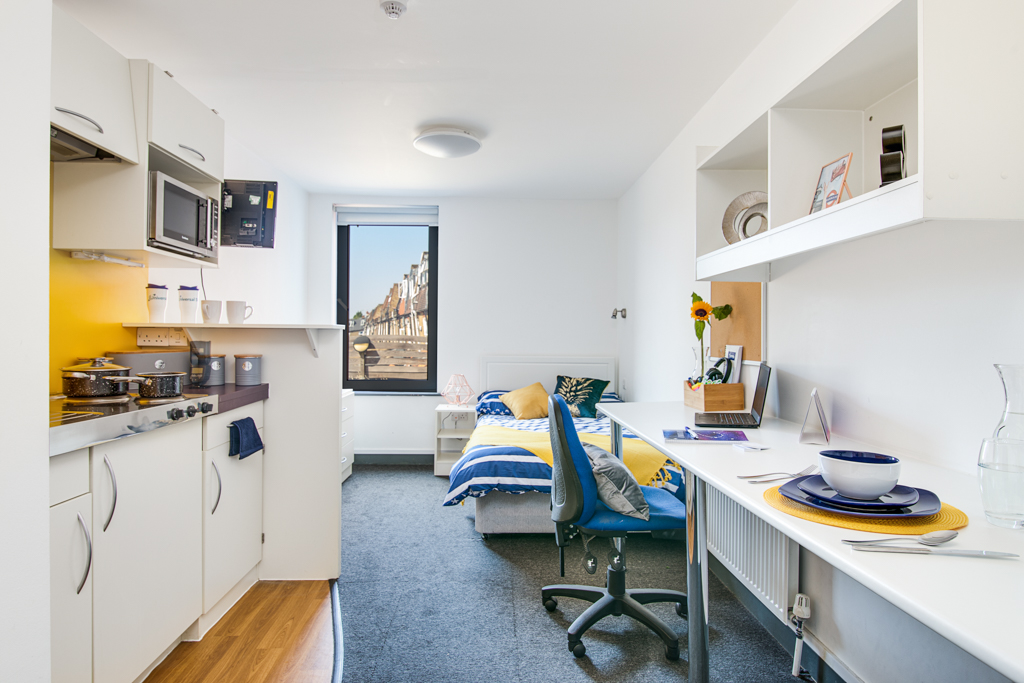 Our Bronze Studio option measures approximately 17 sqm in size and features a comfortable small double bed, ample storage for all your belongings, Wi-Fi enabled study space, a private bathroom and a fully fitted kitchen.The studio is well equipped with all modern amenities required for an easy and comfortable stay.The apartment is completely your own, allowing you privacy and freedom. Study for your exams without any distractions, prepare your meals in the kitchen and relax in the comfort of your own room.