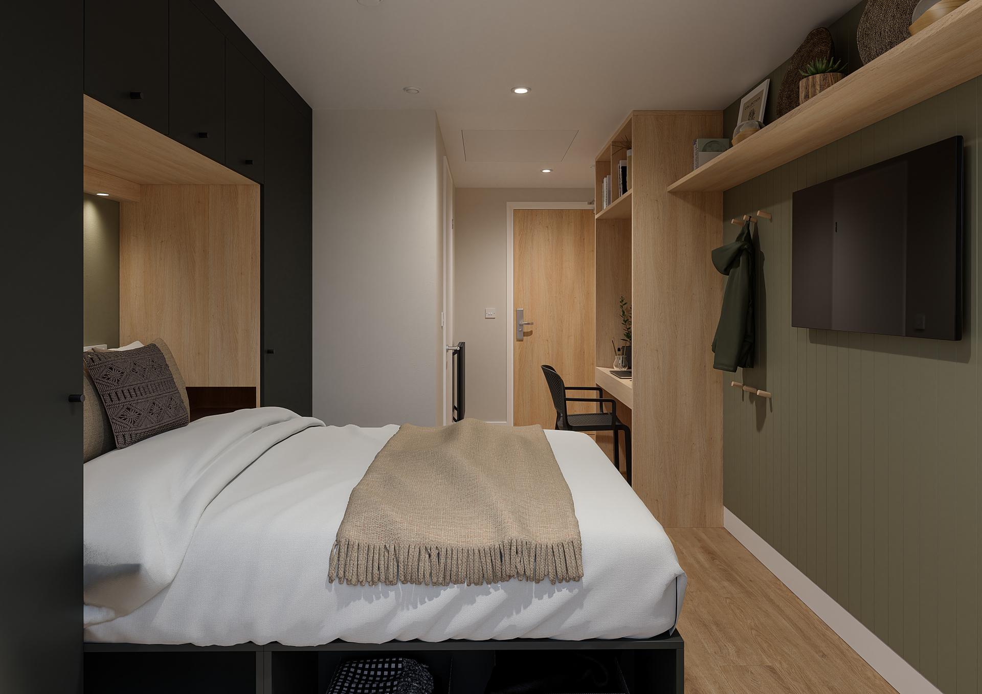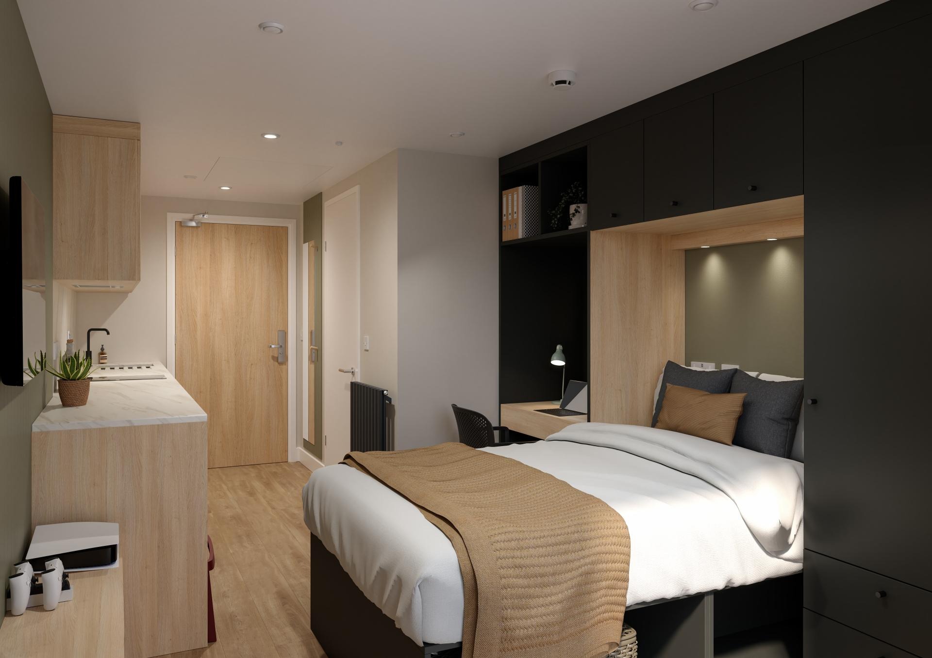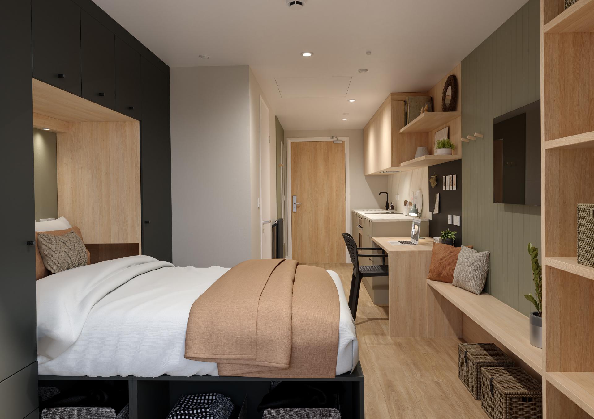 Your personal sanctuary designed for positive living. With calming wood textures and soft pastels, this studio offers a peaceful retreat from busy student life. Thoughtful storage solutions, a luxury en-suite, and a fully equipped kitchenette make everyday living effortless. Whether you’re cooking, relaxing, or hosting friends, every detail helps you feel right at home from day one. All-inclusive utilities and a double bed ensure comfort and convenience, letting you focus on making the most of your university experience. **Price may vary according to the floor level**