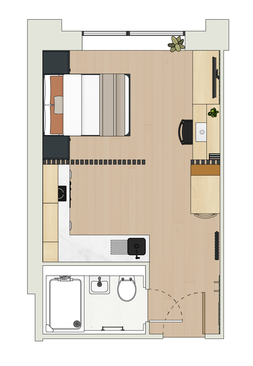 Light, airy, and designed for more. The Deluxe Studio offers extra home office space and abundant natural light, making it the perfect choice for students who need a bit more flexibility in their living arrangement. Suitable for single or dual occupancy, it combines style and practicality, with a fully equipped kitchenette, en-suite bathroom, and thoughtful design. It’s a personal retreat where work and relaxation come together effortlessly. **Price may vary according to the floor level**