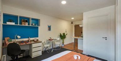 Great to share with friends, a twodio is made up of two bedrooms, a shower room, and a shared kitchen with dining space Located between the first and eighth floor Room sizes can vary from 8.70m2 to 8.79m2 What's in the room? 3/4 size double bed with under bed storage Drawers Magnetic board Mirror Plenty of storage Shared kitchen with induction hob, combi oven, and fridge freezer Shared shower room Study space with desk chair Wardrobe