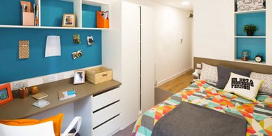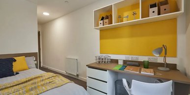 What’s in the room? ¾ size double bed with under bed storage, wardrobe, En-suite bathroom with shower and WC, Full-length mirror, Study desk with drawer space and chair