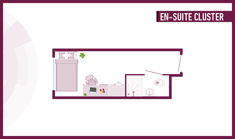 Located on the upper floors with the best views! Each en suite is furnished with a comfortable double bed, under bed storage, study space, and a private en suite. En suite rooms are 11sqm (approx). Additionally, you'll enjoy access to a communal kitchen and living area, complete with a TV to enjoy. The sizes and layouts of en suites may vary throughout the building, so feel free to reach out to our Residents Team if you have any specific requirements.