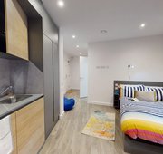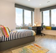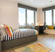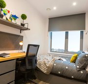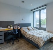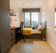 Each en suite is furnished with a comfortable double bed, under bed storage, study space, and a private en suite with extra space! Additionally, you'll enjoy access to a communal kitchen and living area, complete with a TV to enjoy with your flatmates. The sizes and layouts of en suites may vary throughout the building, so feel free to reach out to our Residents Team if you have any specific requirements.