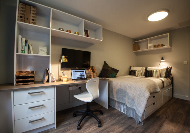 Experience comfortable living in our Gold Studio, designed to offer you everything you need for a great student experience. This cosy space features a comfortable 3-4ft bed, perfect for relaxing after a long day. Stay organised with ample storage, including a spacious wardrobe, a chest of drawers, and handy shelves for your books and personal items. The study desk with a chair provides an ideal spot for focused study sessions. Enjoy the convenience of a private kitchen, equipped with a microwave, oven, and cooking hob, allowing you to cook your favourite meals. The en-suite bathroom comes with a shower, washbasin, and mirror, ensuring privacy and comfort.