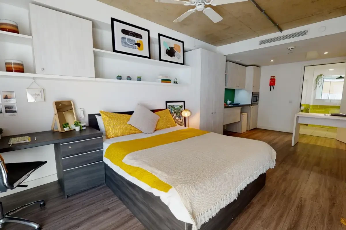 These rooms are finished to a high standard and feature a stylish private kitchenette and accessible bathroom. You also great modern furniture, loads of storage, hardwood floors with underfloor heating, a study area and great building benefits like a cinema room.