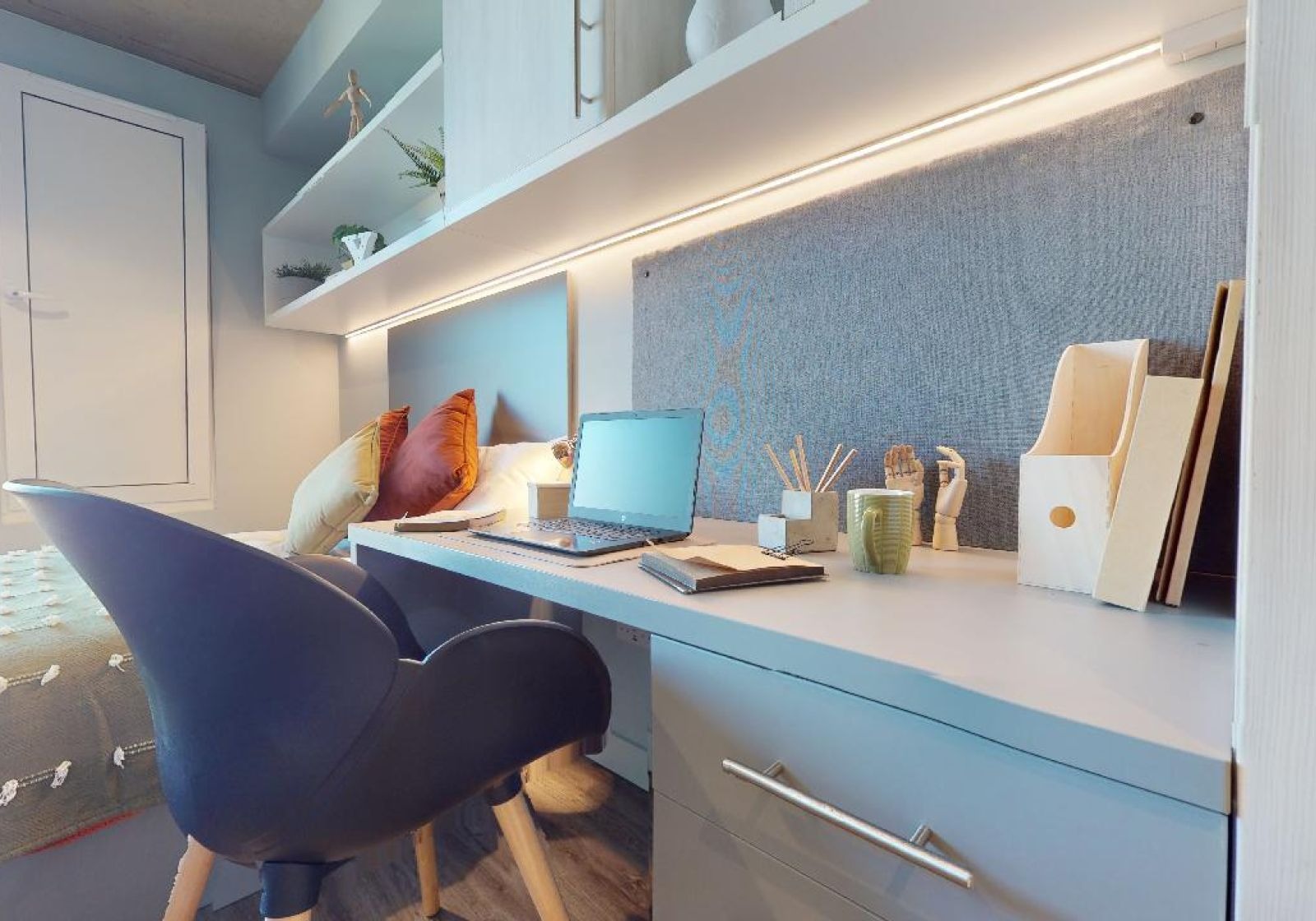 ALDG300-031125Our biggest studios offer everything you need in 23 sq m, including a kitchenette and lots of storage. Dual occupancy is available in these rooms. Located on the upper floors of the building. This newly refurbished studio comes equipped with a bed, study area, storage and en suite shower room, as well as your own kitchenette with combi-oven, hob, fridge and dining area. Our onsite gym and social areas are also available for your use.