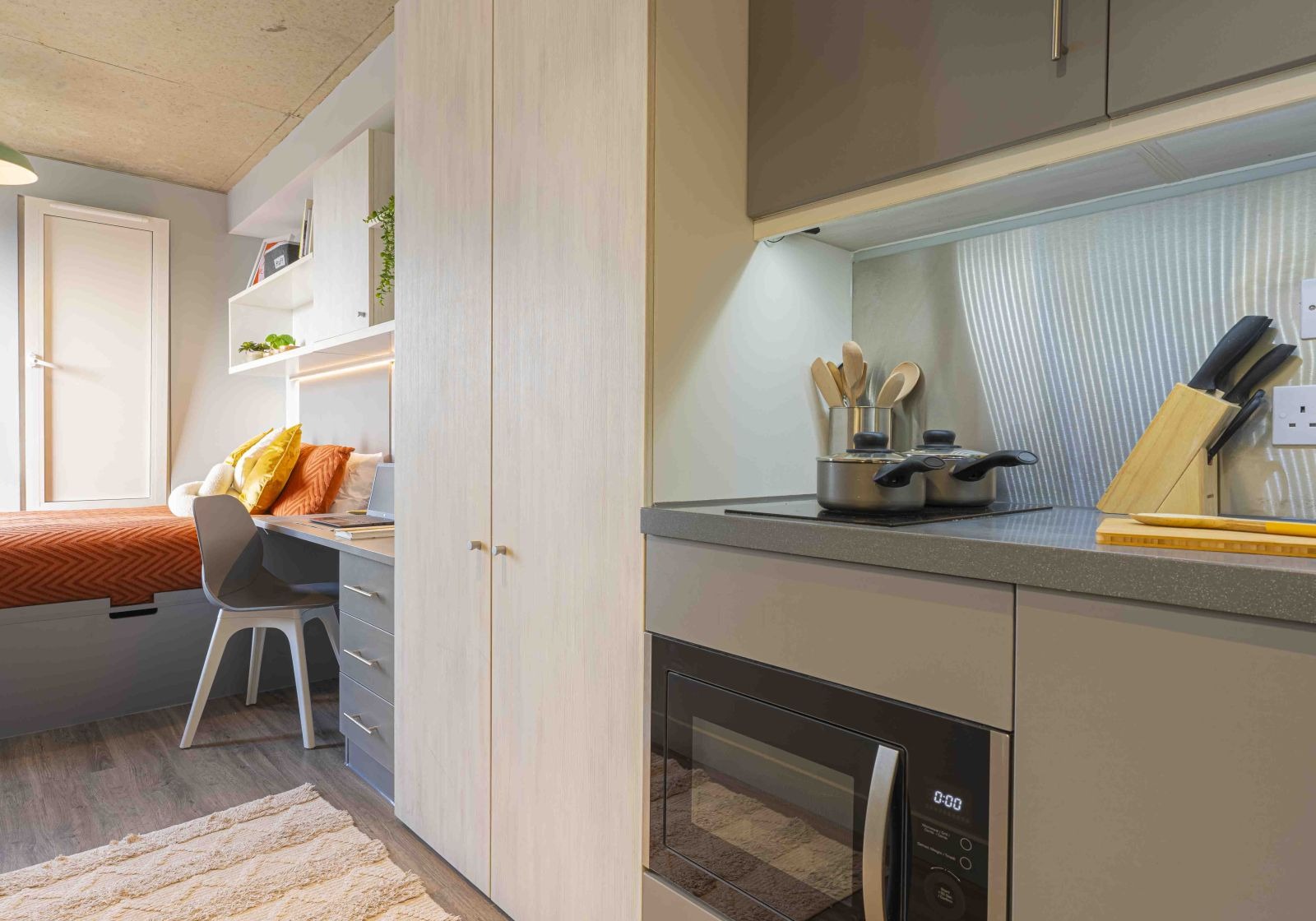 ALDG300-031125Our biggest studios offer everything you need in 23 sq m, including a kitchenette and lots of storage. Dual occupancy is available in these rooms. Located on the lower floors of the building. This newly refurbished studio comes equipped with a bed, study area, storage and en suite shower room, as well as your own kitchenette with combi-oven, hob, fridge and dining area. Our onsite gym and social areas are also available for your use.