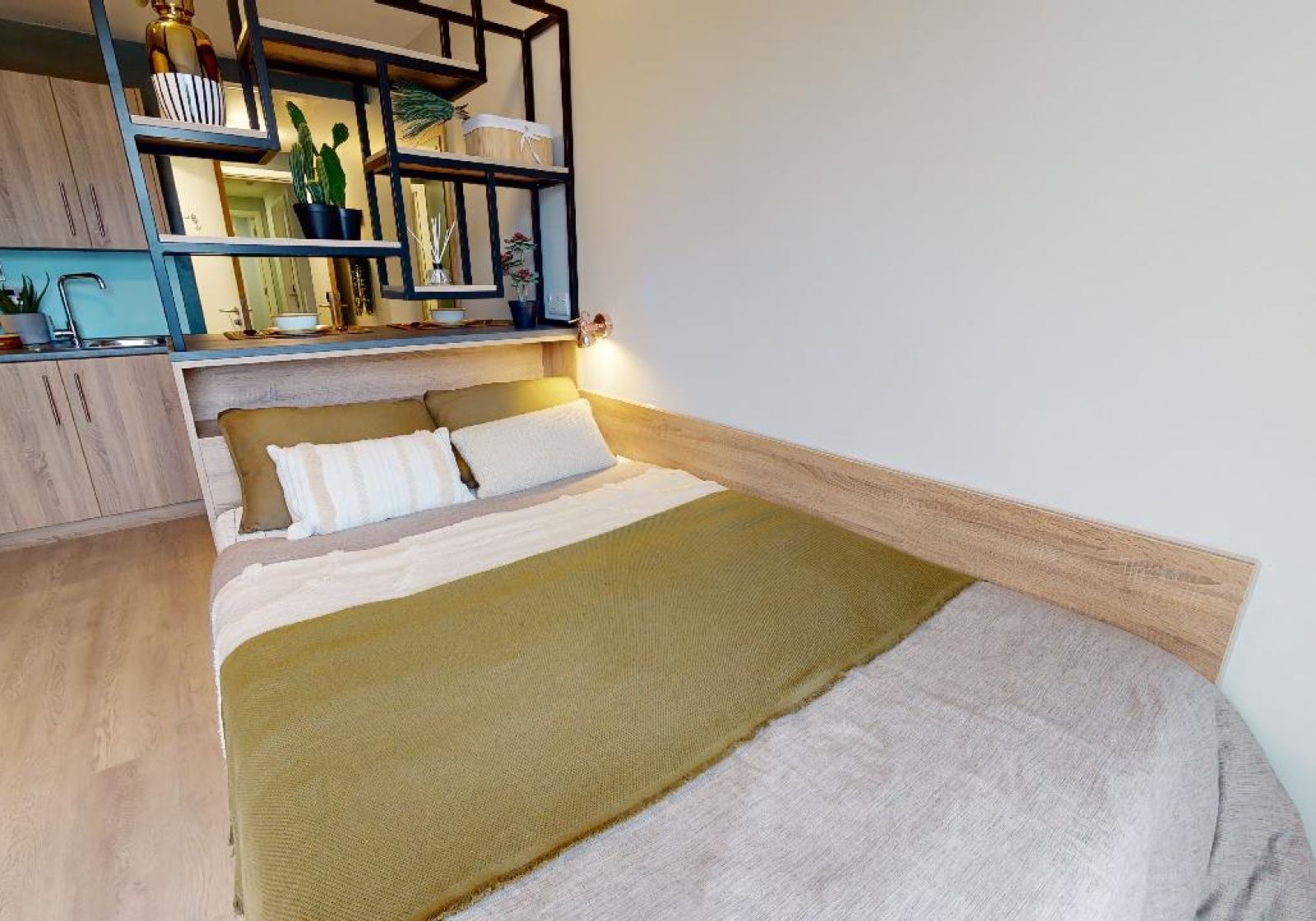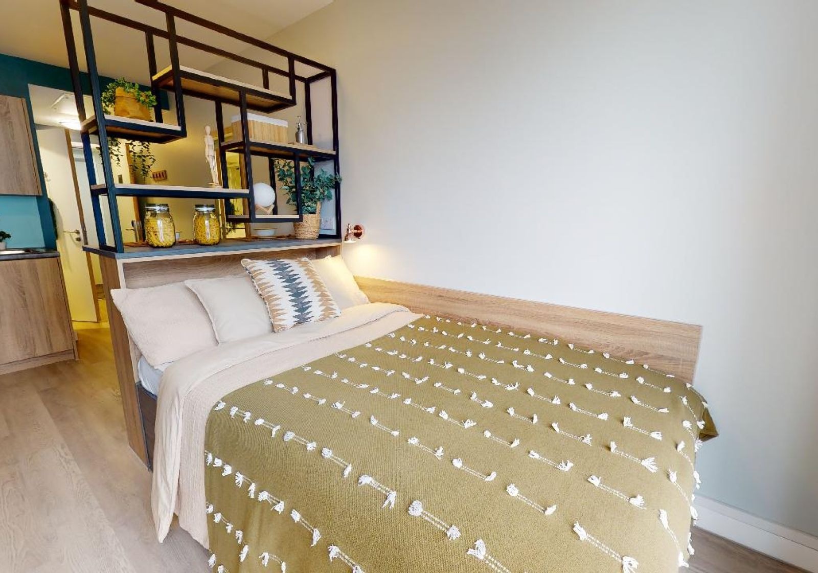 BANK300-031125Our entry-level studios on floors 1-7 are a great deal, with private kitchenette and bathroom as standard and all the essentials. With a decent 17-19 sqm of living space, Bronze Studios also come with a small double bed, lots of storage, study area, hardwood floor with underfloor heating and a breakfast bar with stools. Everything you need for a great student life with maximum privacy.