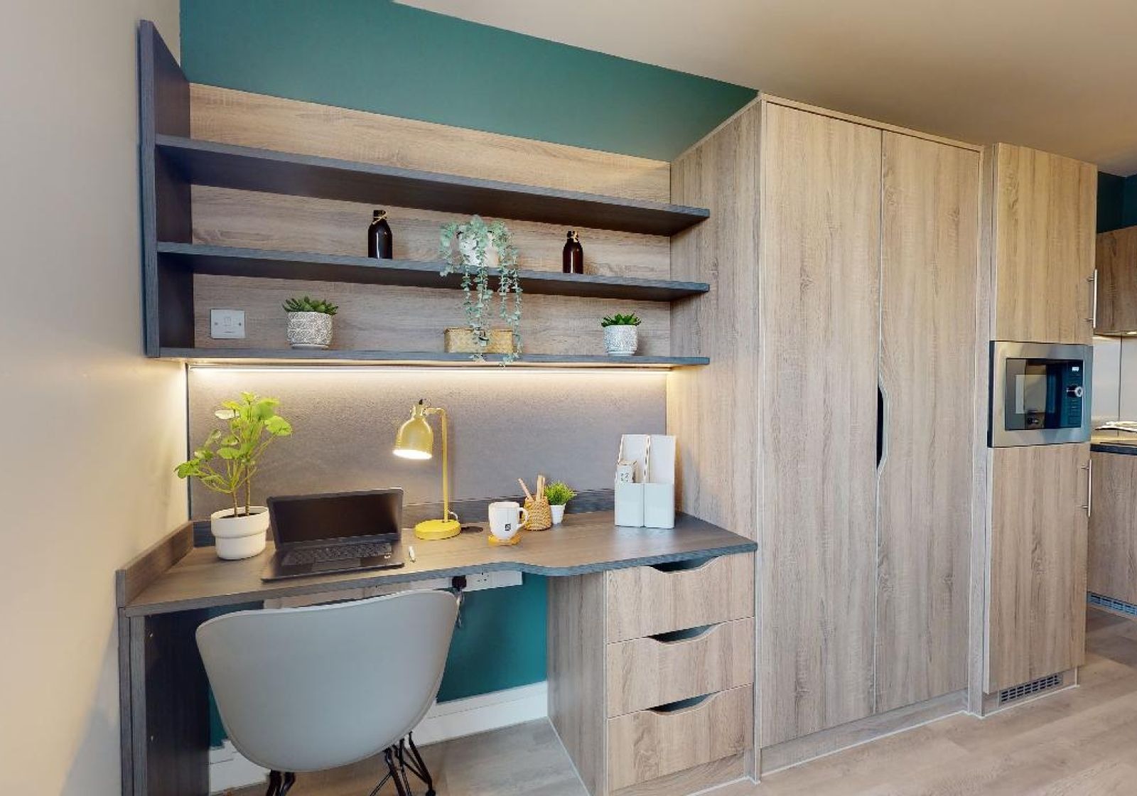 BANK300-031125With a sizeable 23 sq m of living space, Silver Studio Plus' give you more room to relax, study and cook with your fully fitted kitchenette and accessible wet room. On floors 1-7, our Silver Studio Plus gives you extra storage options with small double bed, wardrobe, spacious kitchenette, study area, seating and dining area and en suite shower and toilet in an accessible wet room. Wooden floors and underfloor heating come as standard.