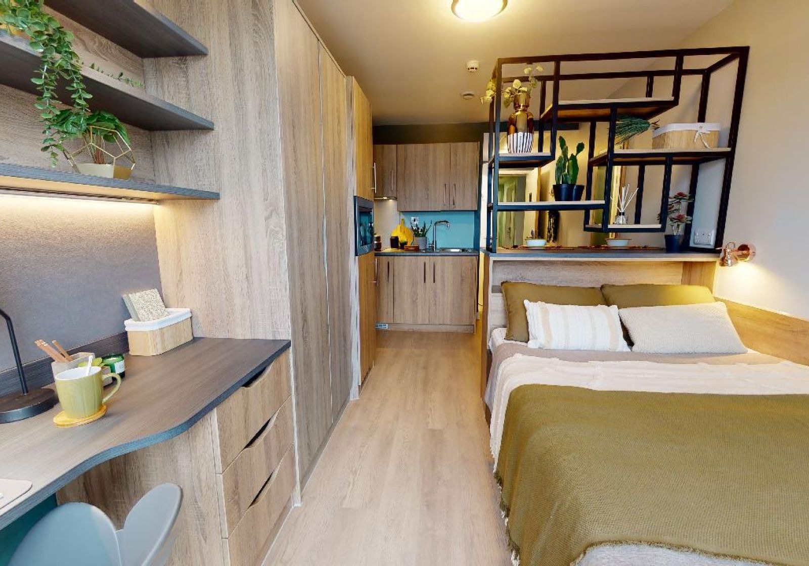 BANK300-031125Our Studios on floors 1-5 give you everything you need, with private kitchenette and bathroom as standard and all the essentials. With a decent 17-19 sqm of living space, these rooms also have a small double bed, plenty of storage, study area, hardwood floor with underfloor heating and a breakfast bar with stools. Everything you need for a great student life with maximum privacy.