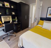 CITY300-031125Located on floors 0-7, these rooms are perfect if you’re looking for more space, style and all the essentials. These rooms are newly refurbished. These great rooms range from 15-24 sq m and come with small double bed, study area, lots of storage, modern furniture, underfloor heating and private bathroom. An open plan kitchen is shared with up to 14 other residents, giving the best of privacy and sociability.