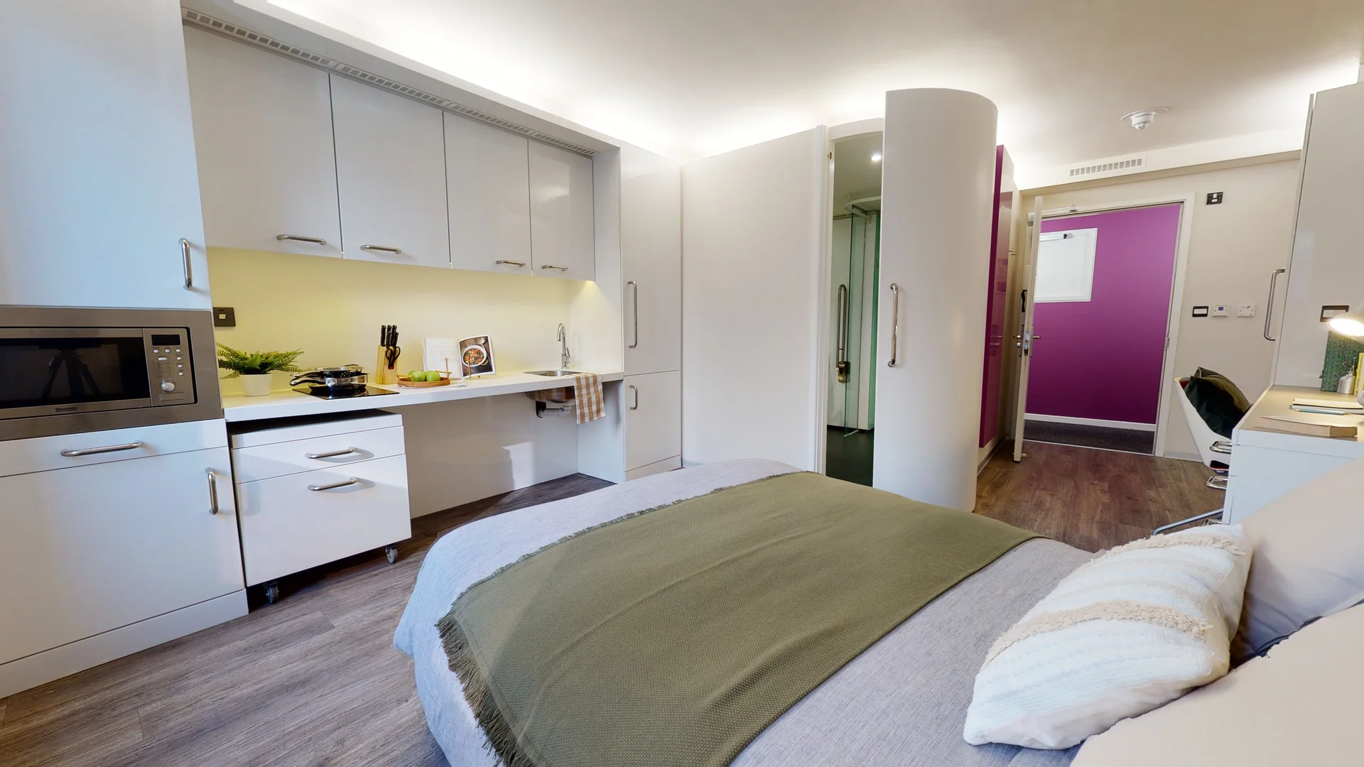 The Platinum Studio offers plenty of living space, equipped with a bed, study area, lots of storage and an en suite shower room. You'll have your own kitchenette with combi-oven, hob, fridge and breakfast bar dining area, and the use of onsite facilities including the gym, lounge and study spaces.