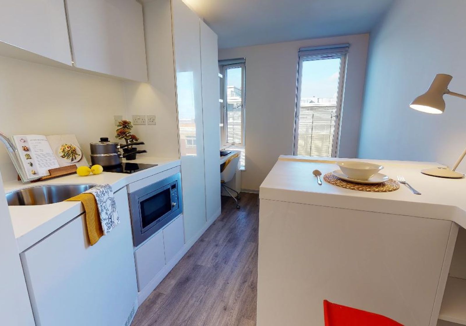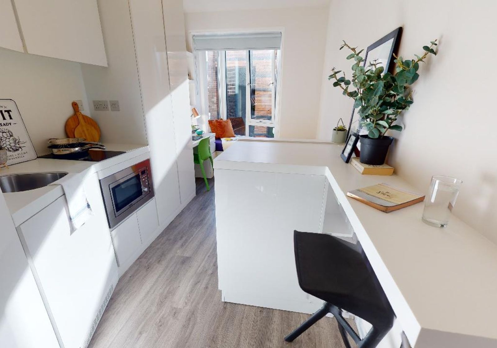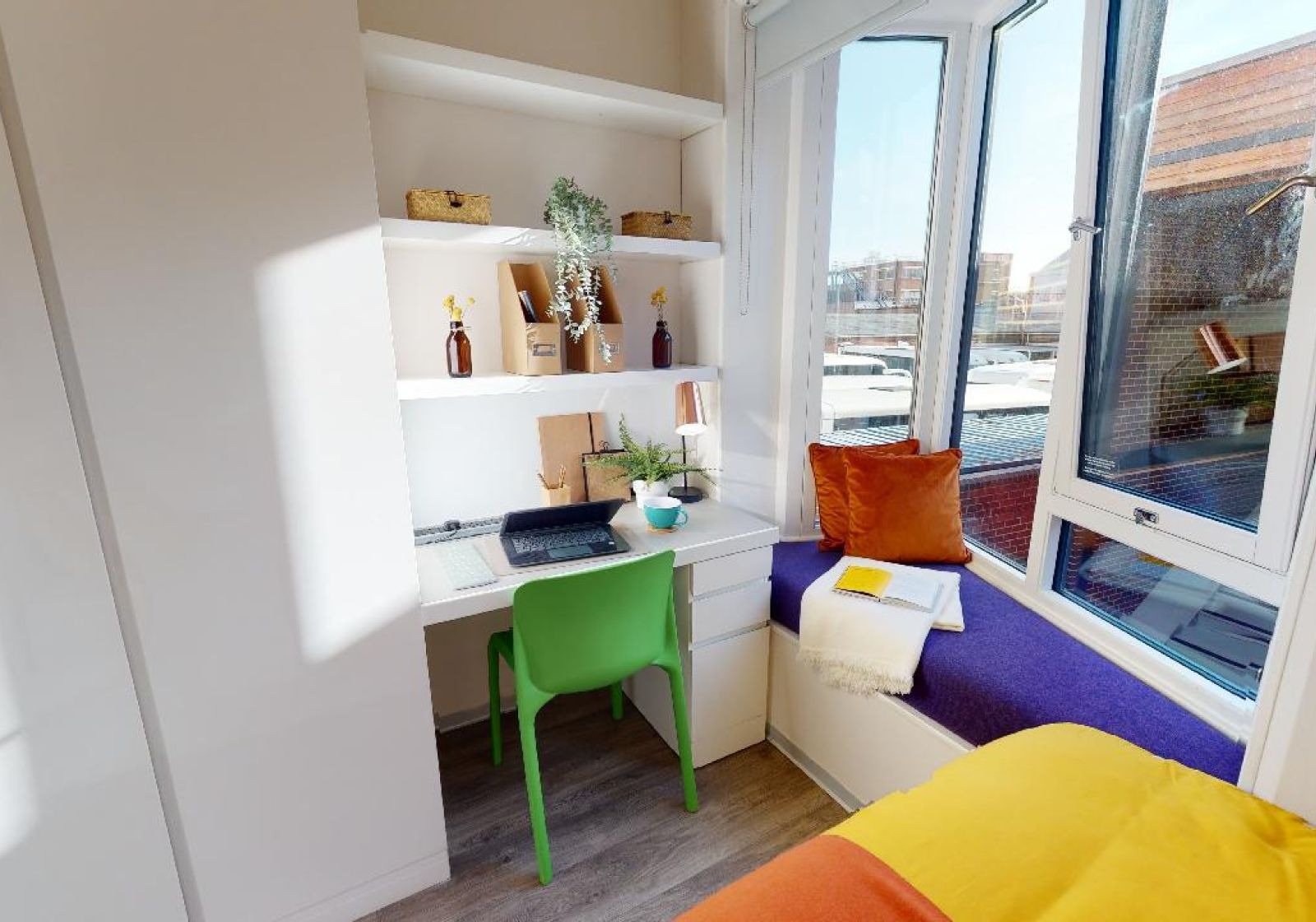 This 13 sq m studio has all the features of our Bronze Studio, with the addition of a window seat area that's perfect for reading and relaxing. This studio gives you plenty of space and comes equipped with a bed, study area, window seat, lots of storage and an en suite shower room. You'll have your own kitchenette with combi-oven, hob, fridge and breakfast bar dining.