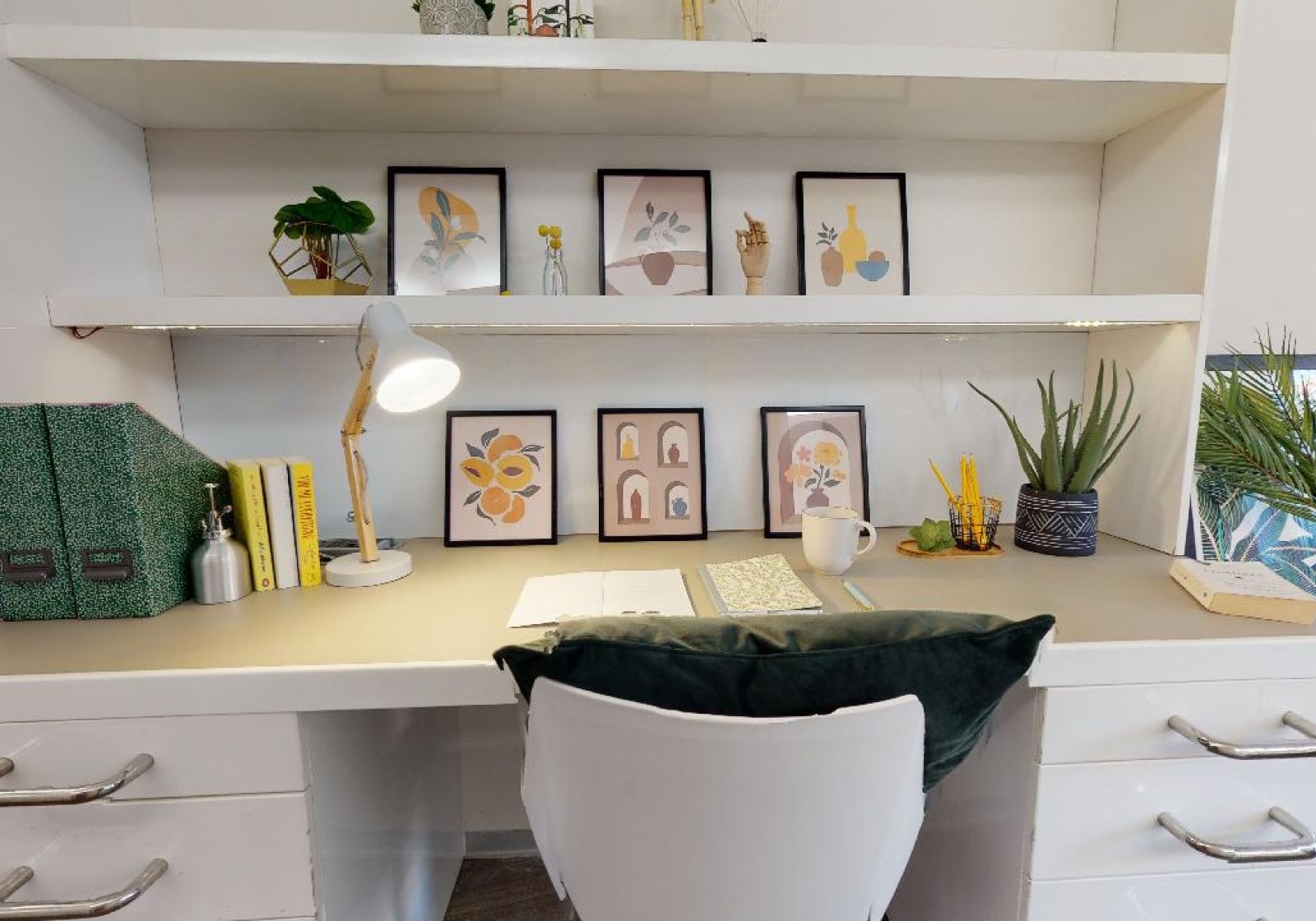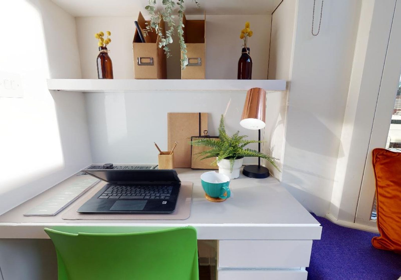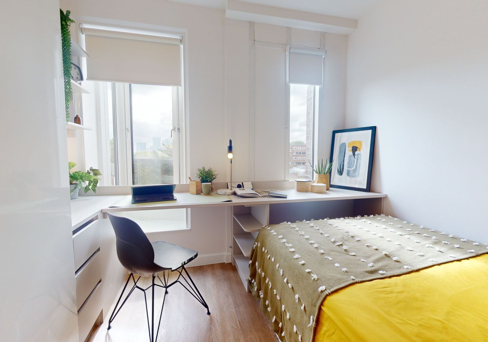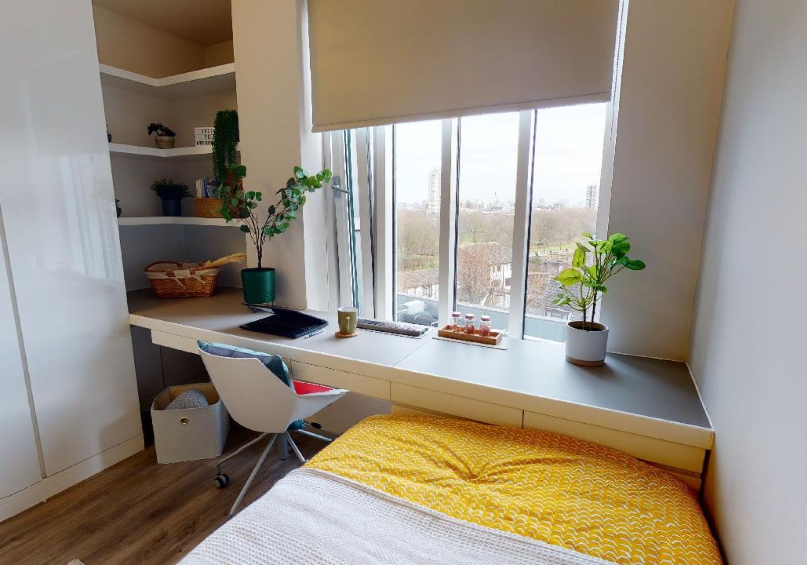 This 13 sq m studio has all the features of our Bronze Studio, with the addition of a window seat area that's perfect for reading and relaxing. This studio gives you plenty of space and comes equipped with a bed, study area, window seat, lots of storage and an en suite shower room. You'll have your own kitchenette with combi-oven, hob, fridge and breakfast bar dining.