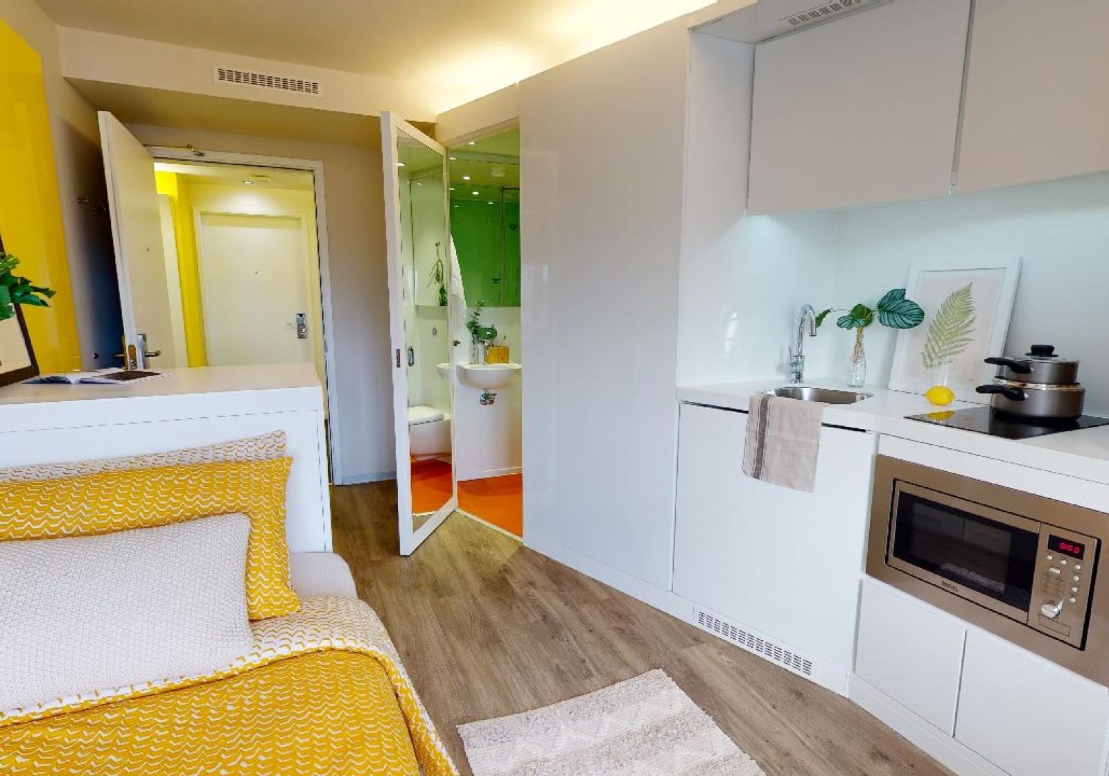 This 14 sq m studio offers privacy and great facilities, with everything you need in one well-designed space. Located on the floors 1-3 of the building.The Bronze Studio gives you plenty of space and comes equipped with a bed, study area, lots of storage and an en suite shower room. You'll have your own kitchenette with combi-oven, hob, fridge and breakfast bar dining area, and the use of onsite facilities including the gym, lounge and study spaces.