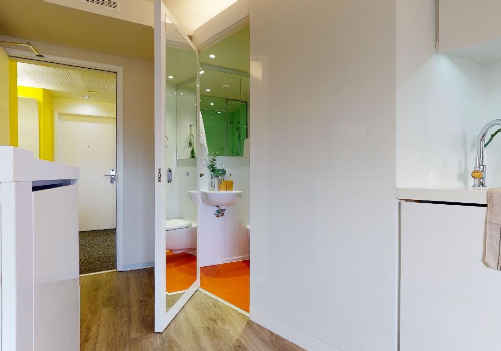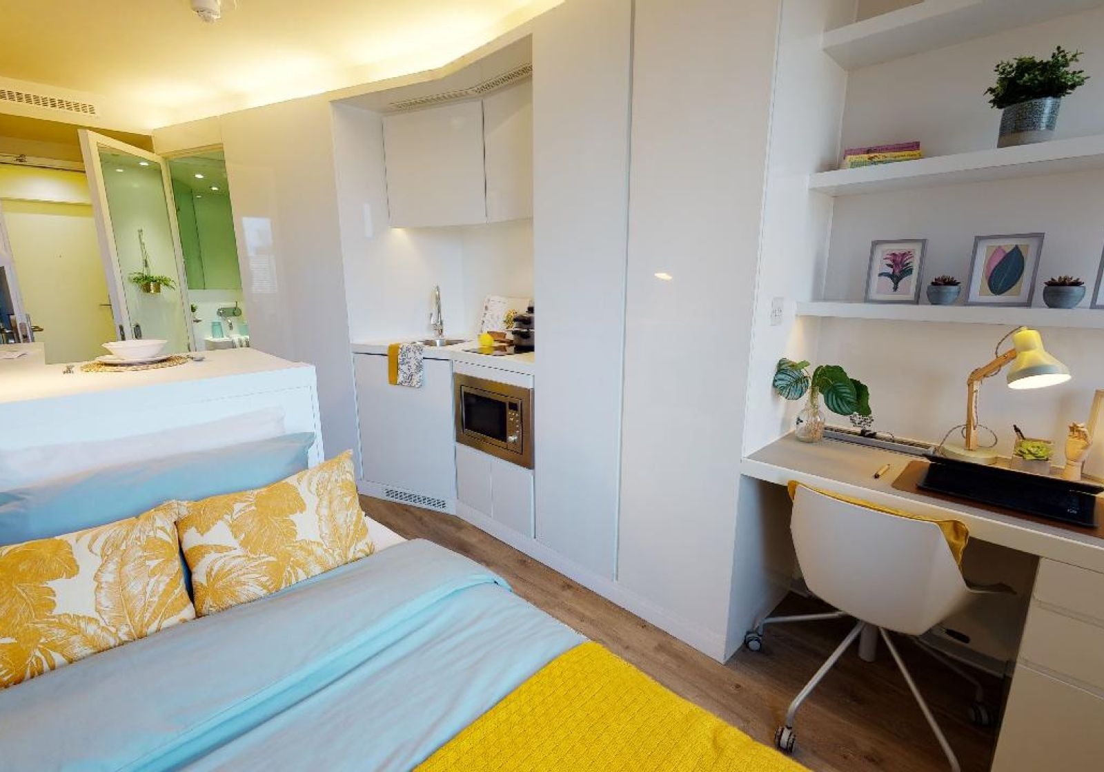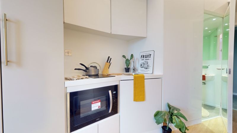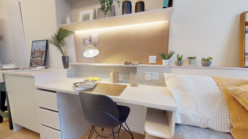 Offering a bit more room than the SIlver Studio Plus, this 16-17 sq m studio has all you need for student life in one place. Located on the upper floors of the building. A Gold Studio Plus gives you plenty of space and comes equipped with a bed, study area, lots of storage and an en suite shower room. You'll have your own kitchenette with combi-oven, hob, fridge and breakfast bar dining area, and the use of onsite facilities including the gym, lounge and study spaces.