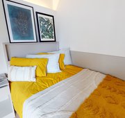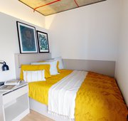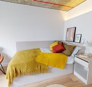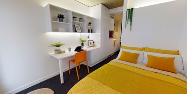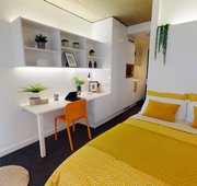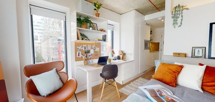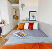 FLIN300-041124Our biggest studios offer everything you need in 23 sq m, including a kitchenette and lots of storage. Dual occupancy is available in these rooms. Located on the lower floors of the building. This studio comes equipped with a bed, study area, storage and en suite shower room, as well as your own kitchenette with combi-oven, hob, fridge and dining area. Our onsite gym and social areas are also available for your use.