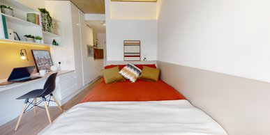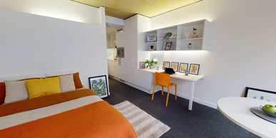FLIN300-031125This 15 sq m studio offers privacy and great facilities, with everything you need in one well-designed space. Located on floors 4-7. The Bronze Studio Plus gives you plenty of space and comes equipped with a bed, study area, storage and en suite shower room, as well as your own kitchenette with combi-oven, hob, fridge and dining area. Our onsite gym and social areas are also available for your use.
