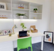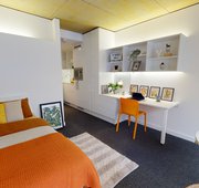 FLIN300-041124Our biggest studios offer everything you need in 23 sq m, including a kitchenette and lots of storage. Dual occupancy is available in these rooms. Located on the upper floors of the building. This studio comes equipped with a bed, study area, storage and en suite shower room, as well as your own kitchenette with combi-oven, hob, fridge and dining area. Our onsite gym and social areas are also available for your use.