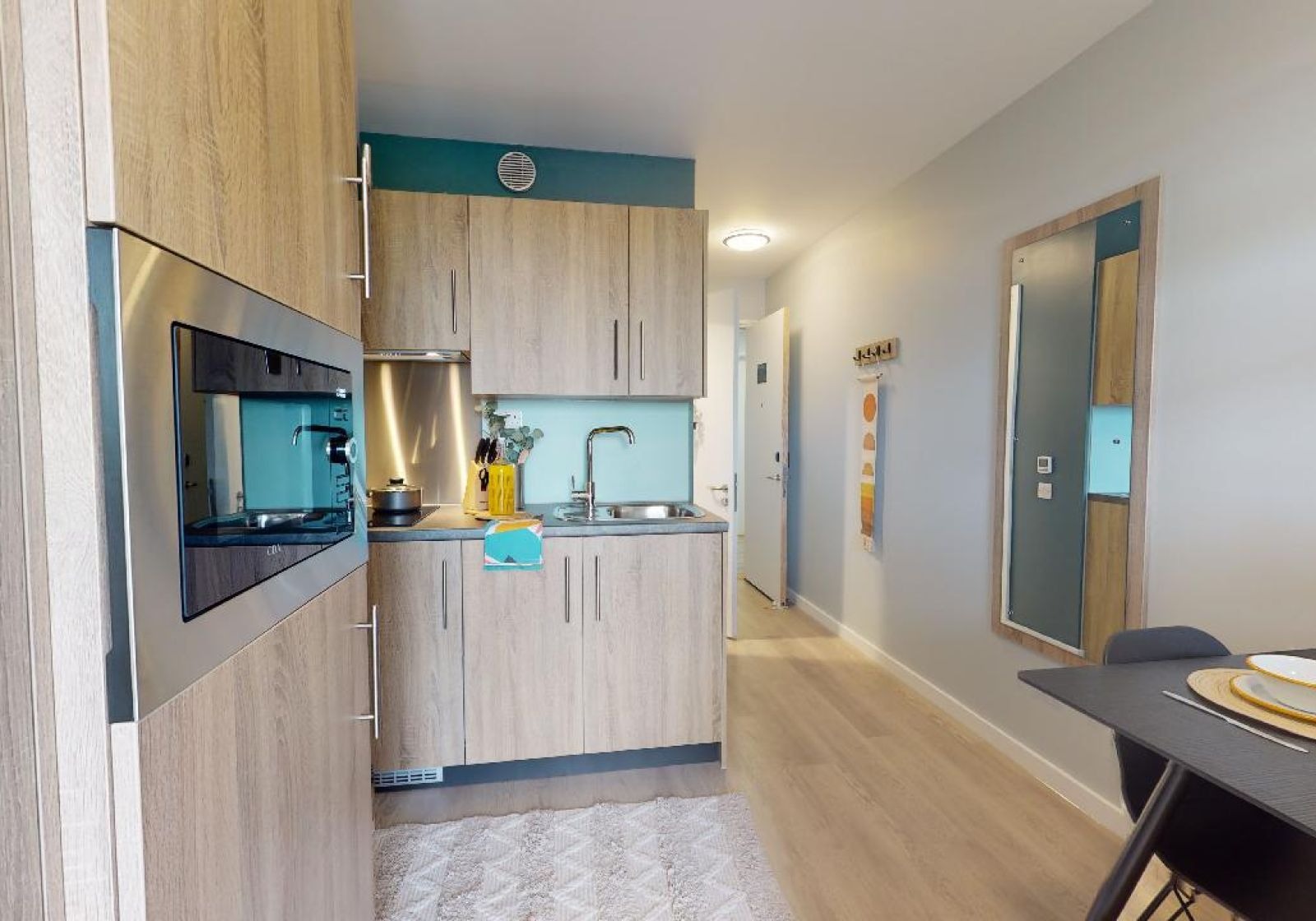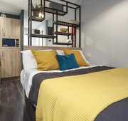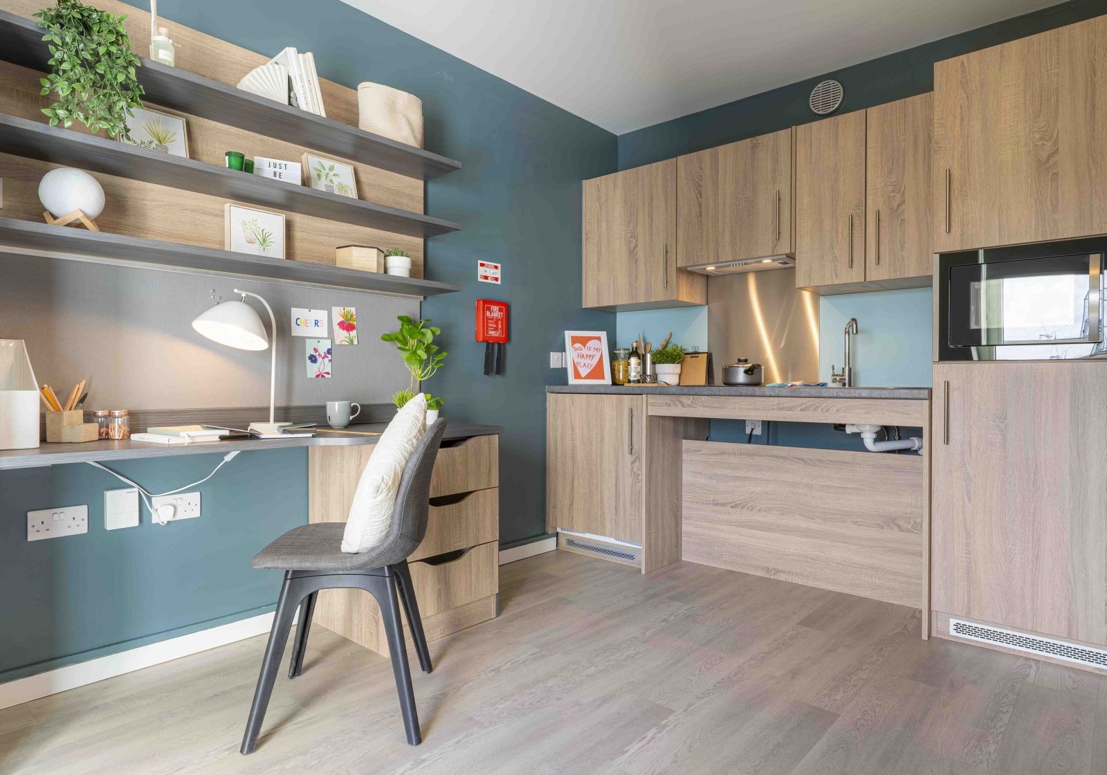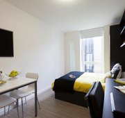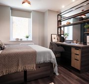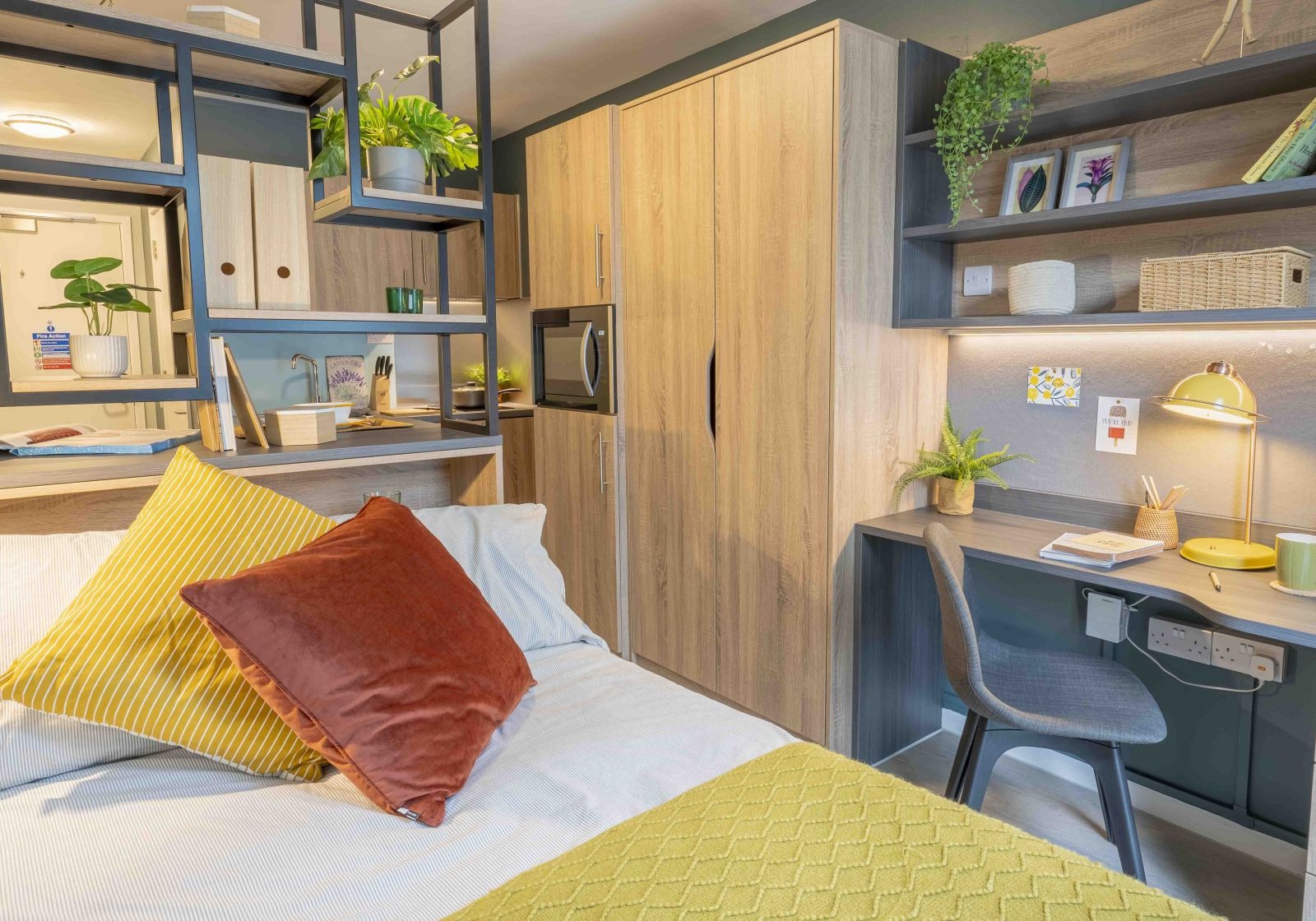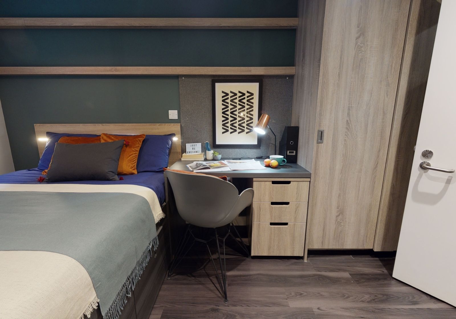 HAMM300-031125These rooms feature slick contemporary design, small double bed, wardrobe, study area, seating and dining area and an en suite shower room. With private kitchenette and underfloor heating included, it’s carefully designed to make best use of the space. You also get use of the building’s cinema, gym, stylish social spaces and huge courtyard.