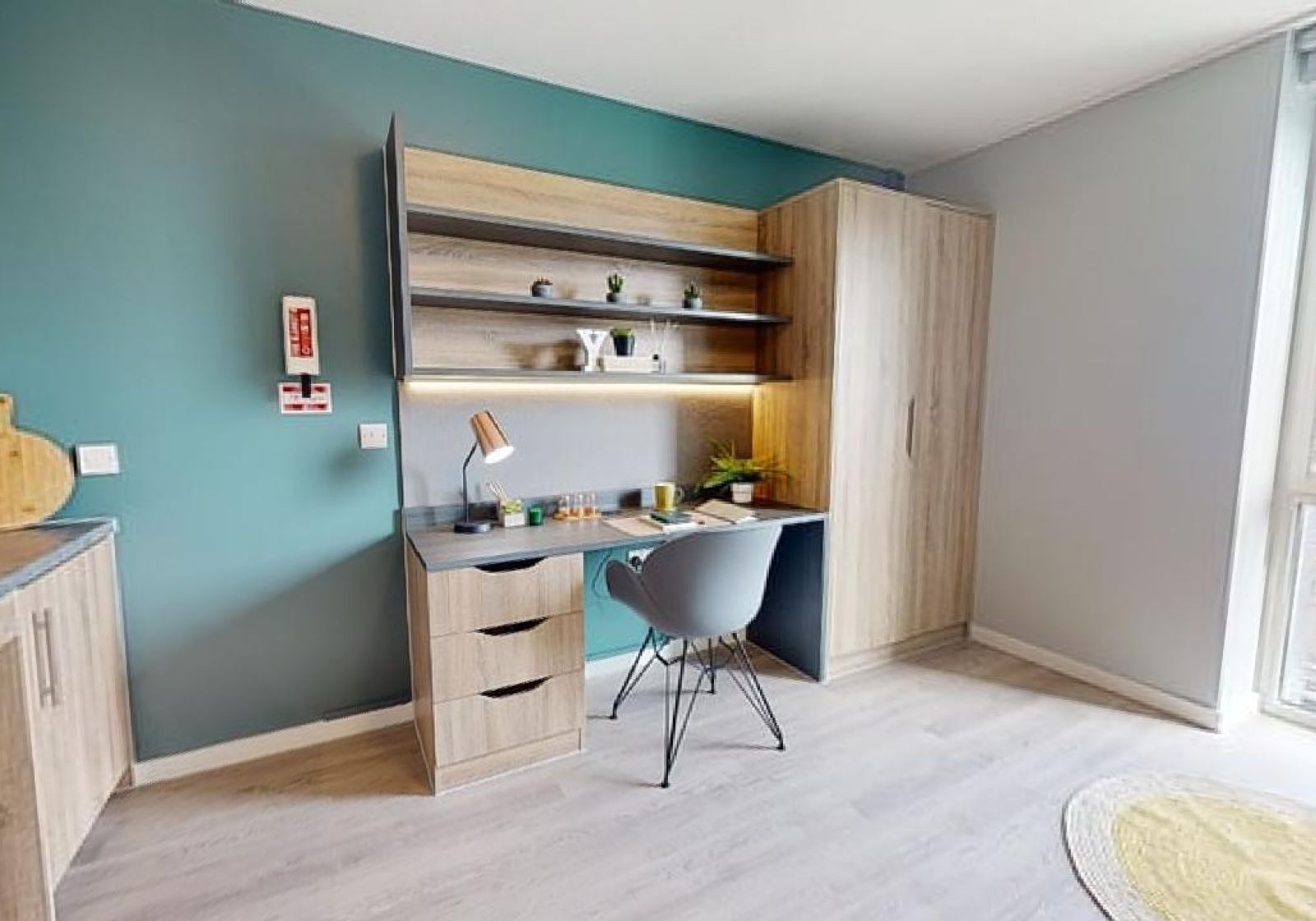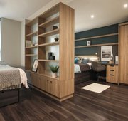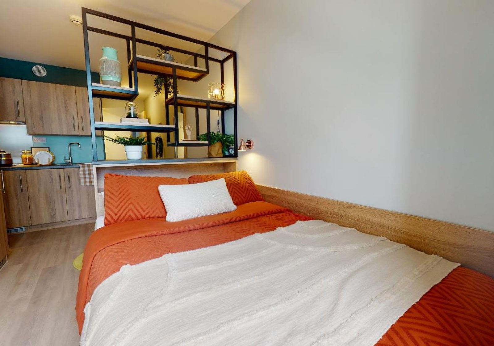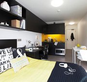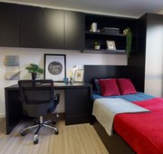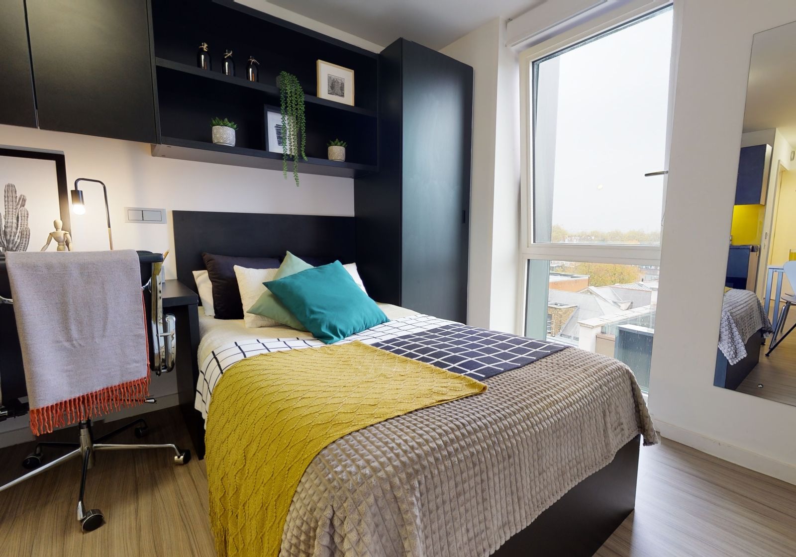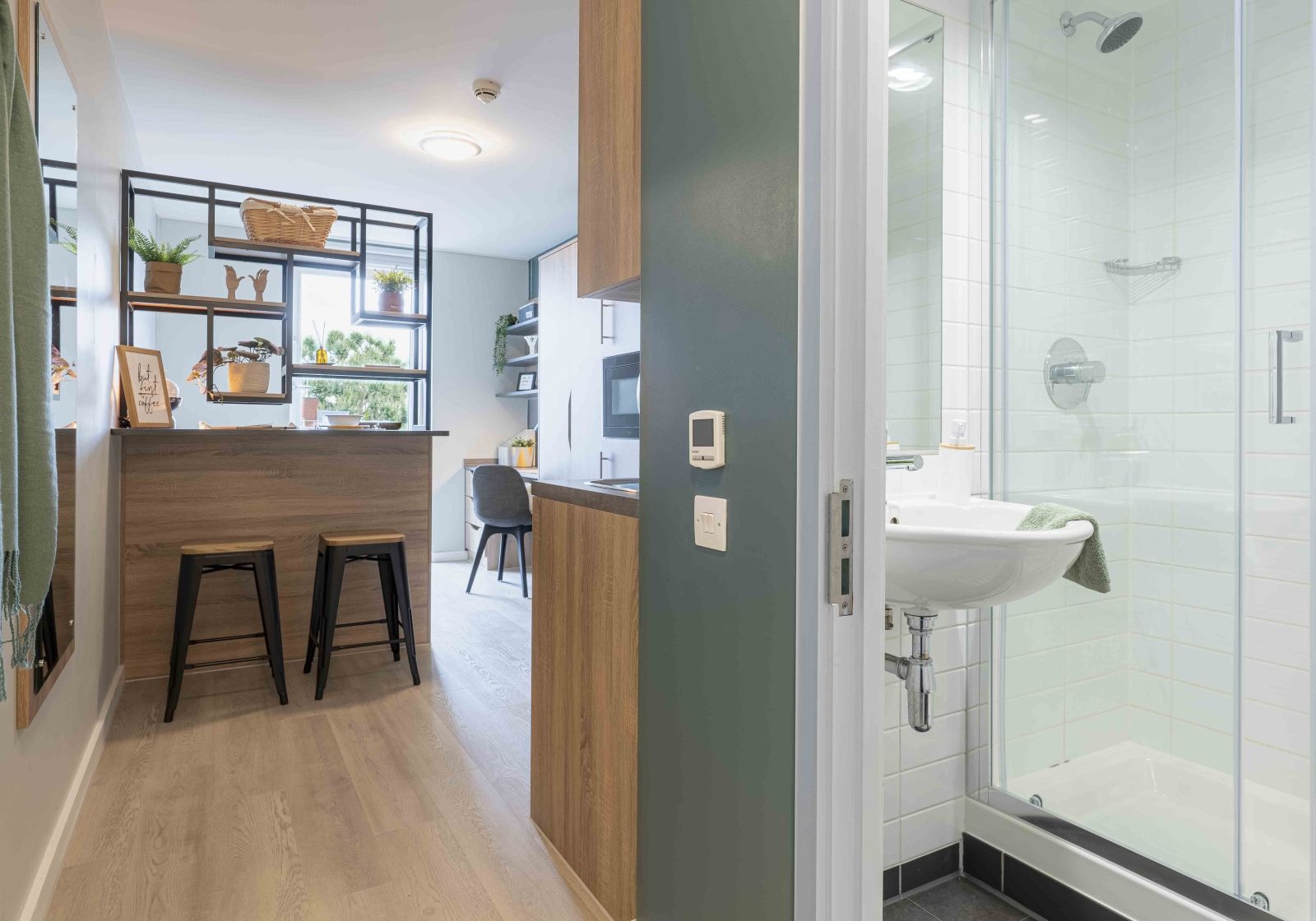 HAMM300-031125These rooms feature slick contemporary design, small double bed, wardrobe, study area, seating and dining area and an en suite shower room. With private kitchenette and underfloor heating included, it’s carefully designed to make best use of the space. You also get use of the building’s cinema, gym, stylish social spaces and huge courtyard.
