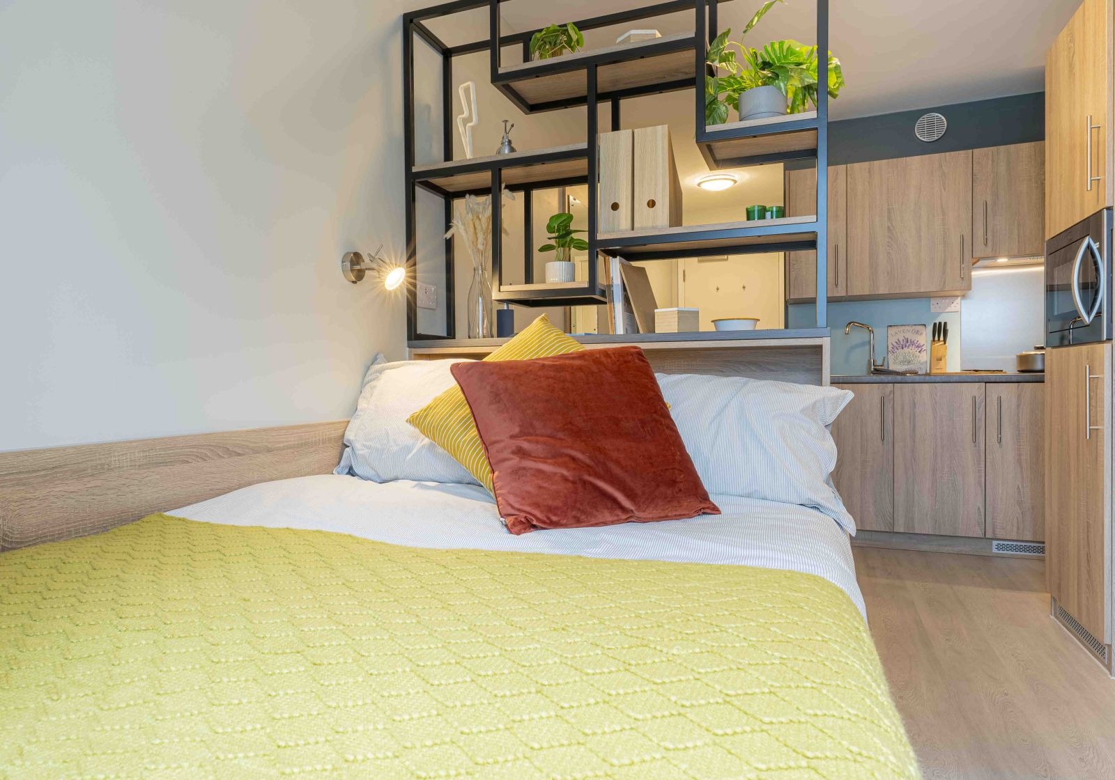 HAMM300-031125Offering over a third more space than our biggest standard Studios, these excellent rooms are finished to a high standard with great facilities. These rooms are newly refurbished. Located on floors 2-5, Bronze Studio Large give you a huge 27 sq m of space to live, relax, cook, study and entertain. They come with a small double bed, underfloor heating, wardrobe, study area, a dining area, private kitchenette and an en suite shower room. These rooms are also accessible.