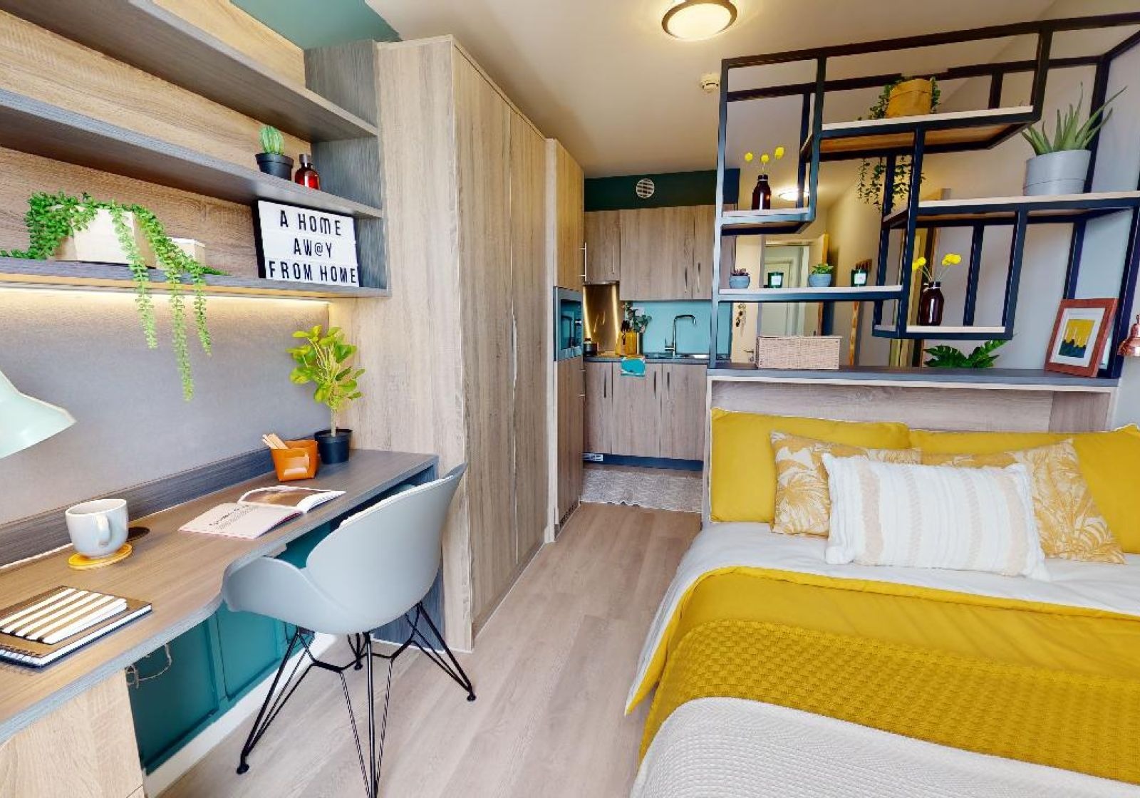 HAMM300-031125These well-proportioned top-floor studios offer 27 sq m of living space with excellent features and impressive city views. Situated on the 9th floor, these studios give you a double bed, wardrobe, study area, TV, and sofa, as well as a private kitchenette, dining area and a large shower room. You can also use our cinema room, gym and large social spaces.