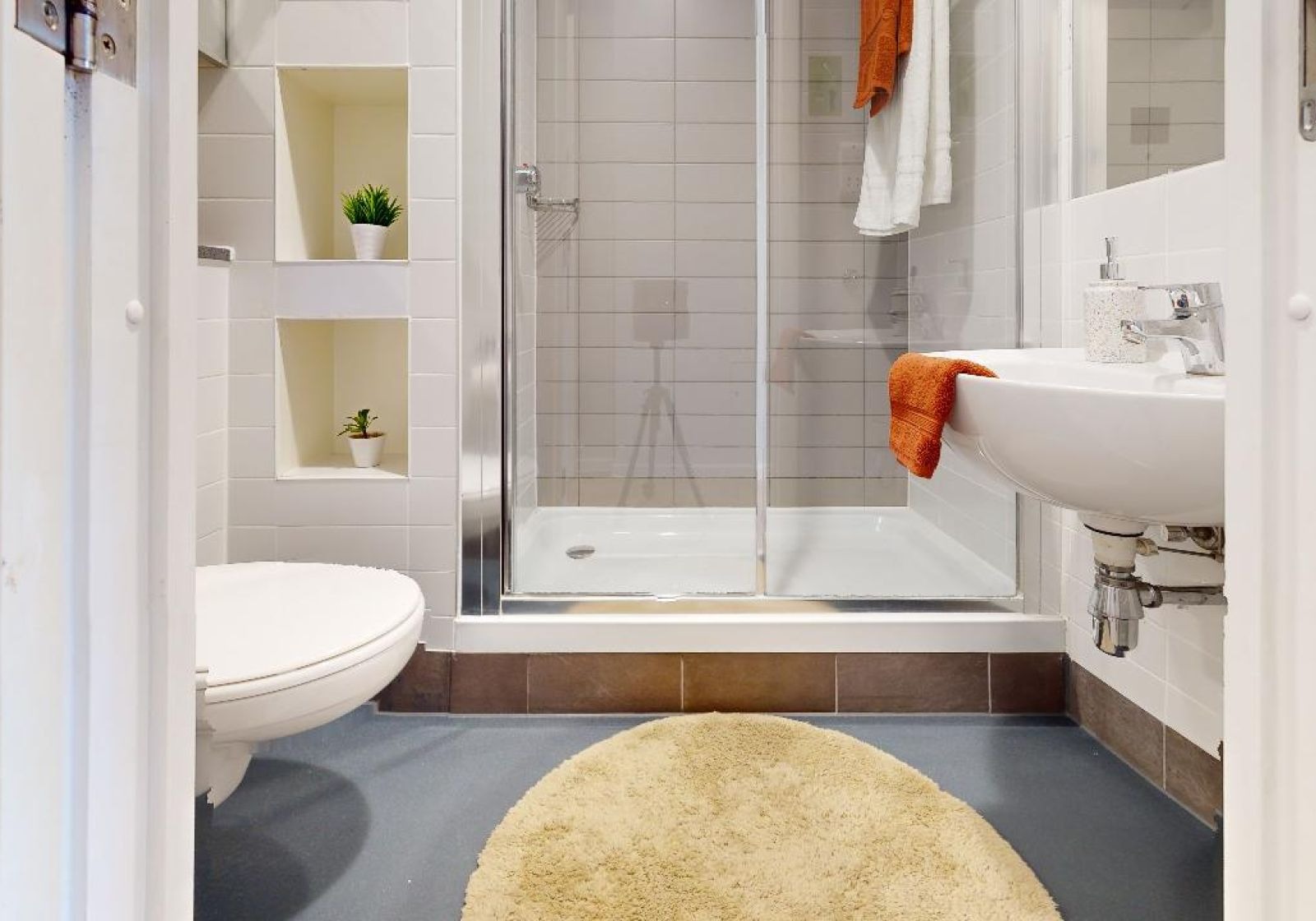 HIGH350-031125These en suite rooms offer great value and have the use of a shared kitchen and living area. With 14-15 sq m of living space, these rooms on floors 1-5 include a small double or double bed, study area, plenty of storage and underfloor heating. As well as a private shower room of your own, you have access to a shared kitchen and living area with TV and all-new appliances.