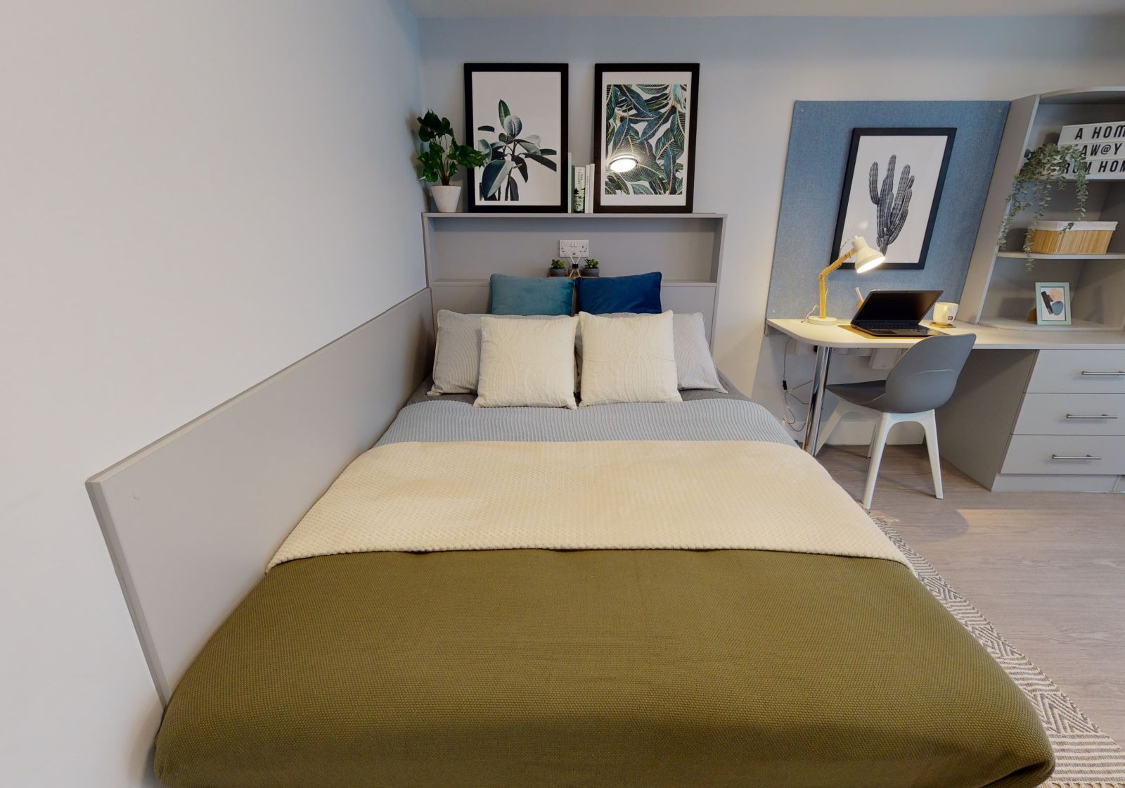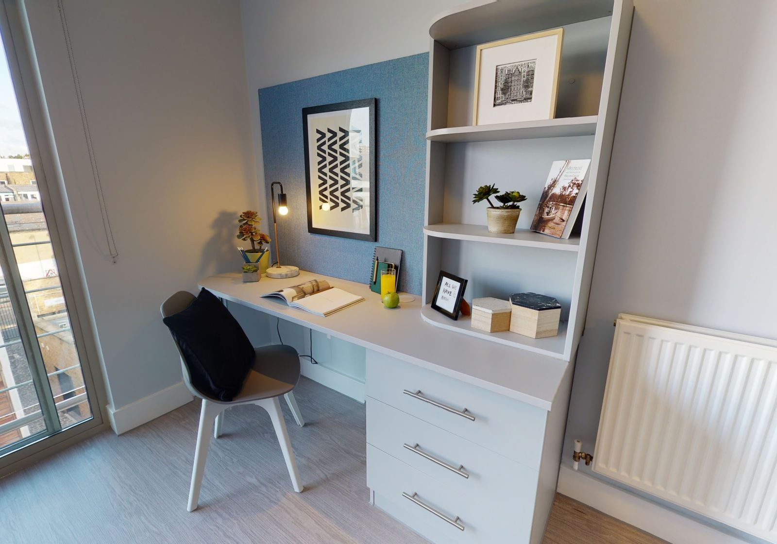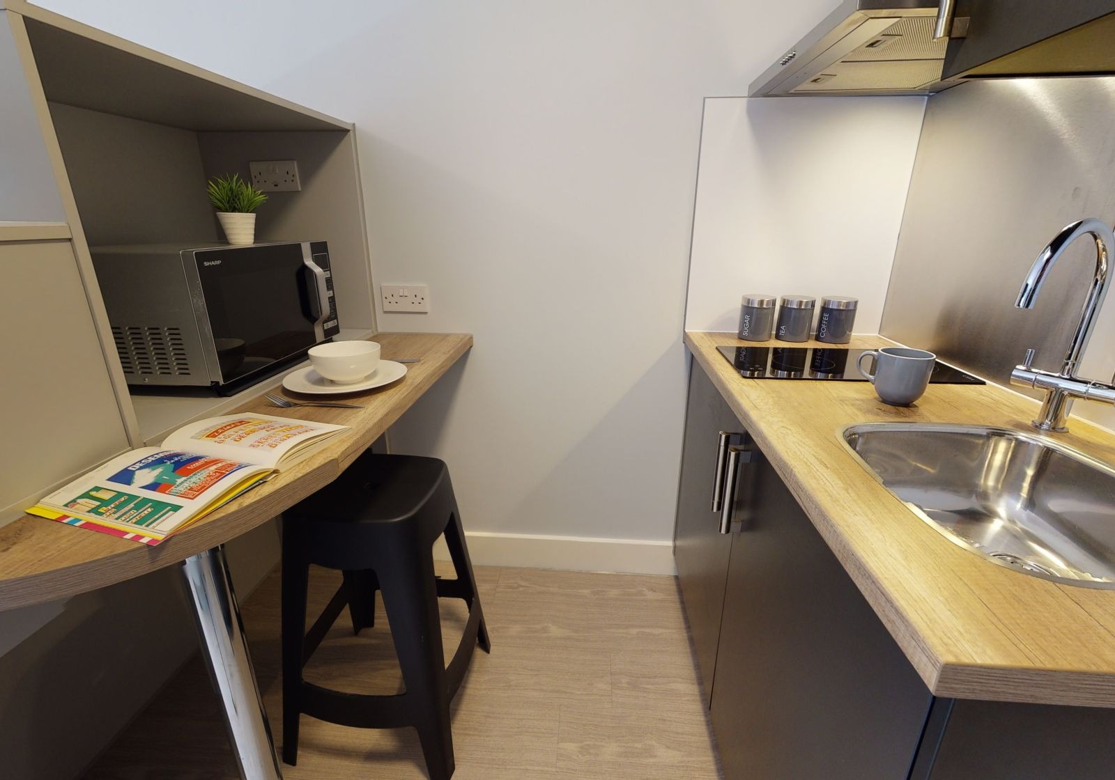 HOXT300-031125The Bronze Studio Plus provides you with 17 sq m of space and includes a small double bed, private kitchenette with combi oven, shower room and study area, as well as USB power points and lots of storage. A divider keeps your bedroom and kitchenette separate, and provides a useful breakfast bar dining space. You can work out in our upgraded gym, watch movies in our cinema, and get on with your work in our flexible study space. And when that’s done, social spaces including a courtyard and roof terrace offer a variety of places to relax. Located on floors 1-4 our Bronze Studio Plus gives you a new kitchenette and furnishings, and a newly fitted en suite shower room along with separated bedroom space.