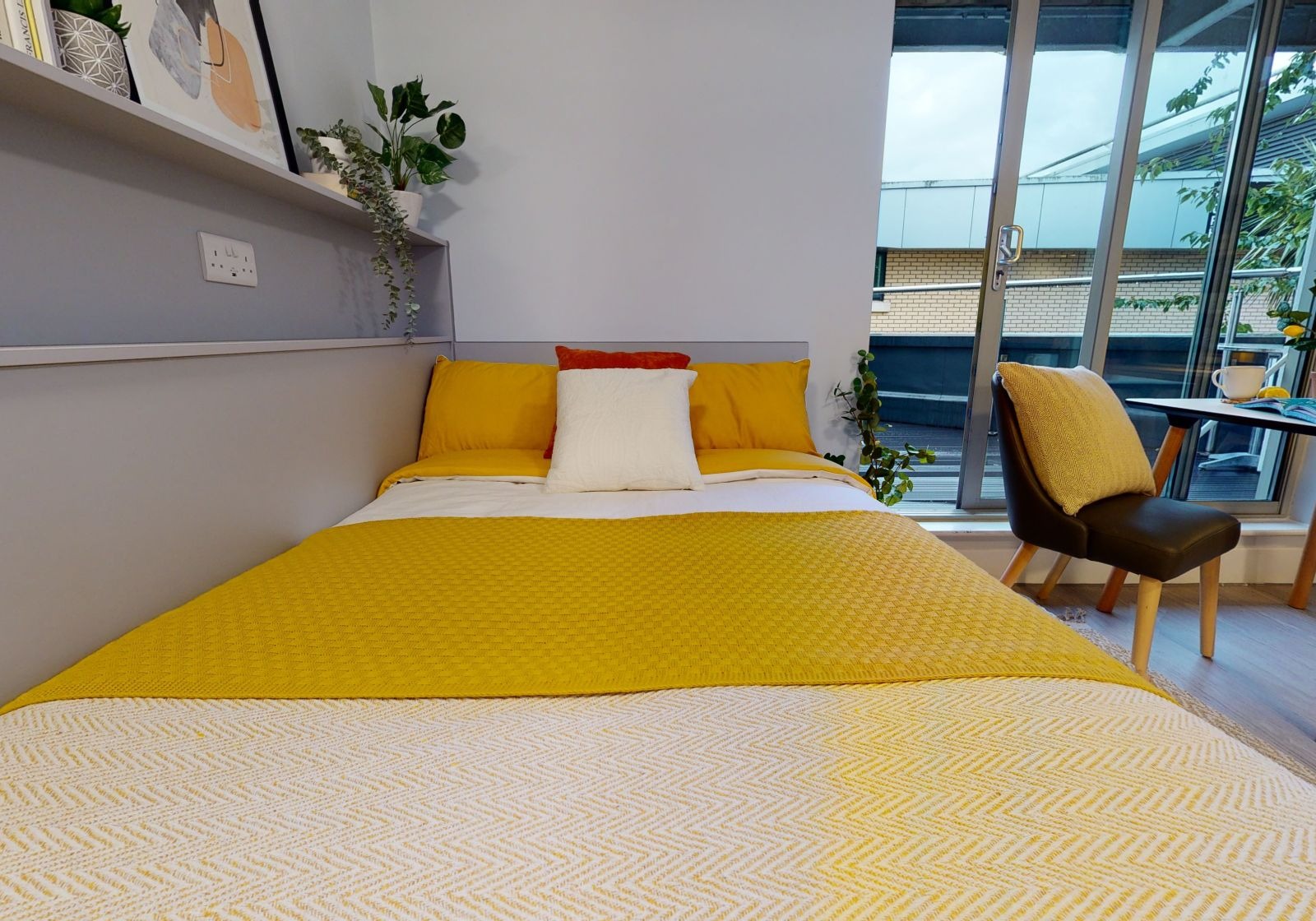 HOXT300-031125These self-contained studios fit a lot into their well-designed floor plan, featuring a Juliet balcony alongside a private bathroom and kitchen. Silver Studios include a private en suite shower room, small double bed, fully fitted kitchenette and a living and study area. Use of the building’s gym and stylish social space is included.